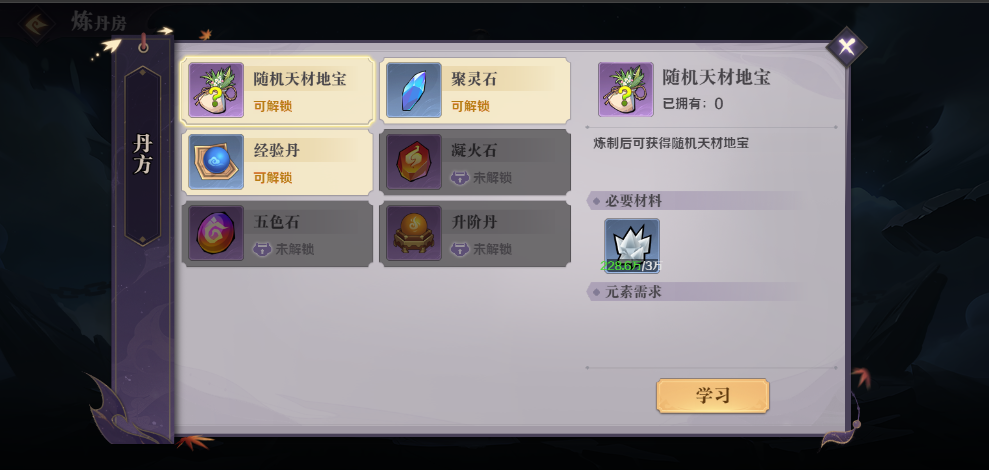 进门先右拐,记得先到仙盟商店中买配方,再到炼丹房内学习。炼制需要消耗由八荒中寻到的天材地宝,没有找到也没关系,我们也可通过炼制天地精华随机获得。