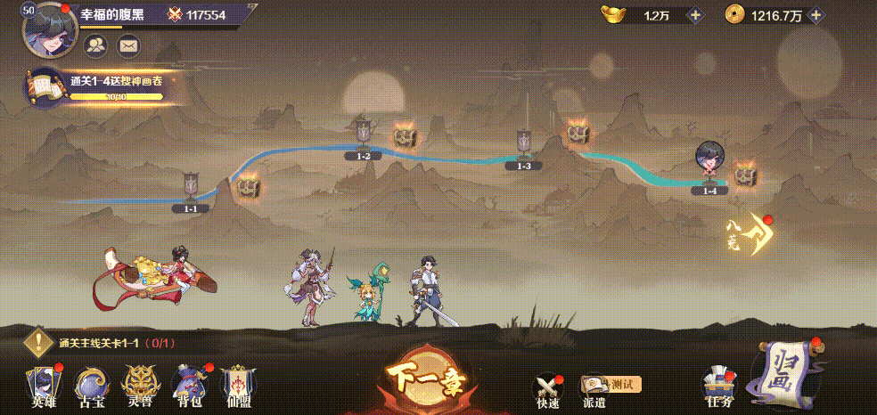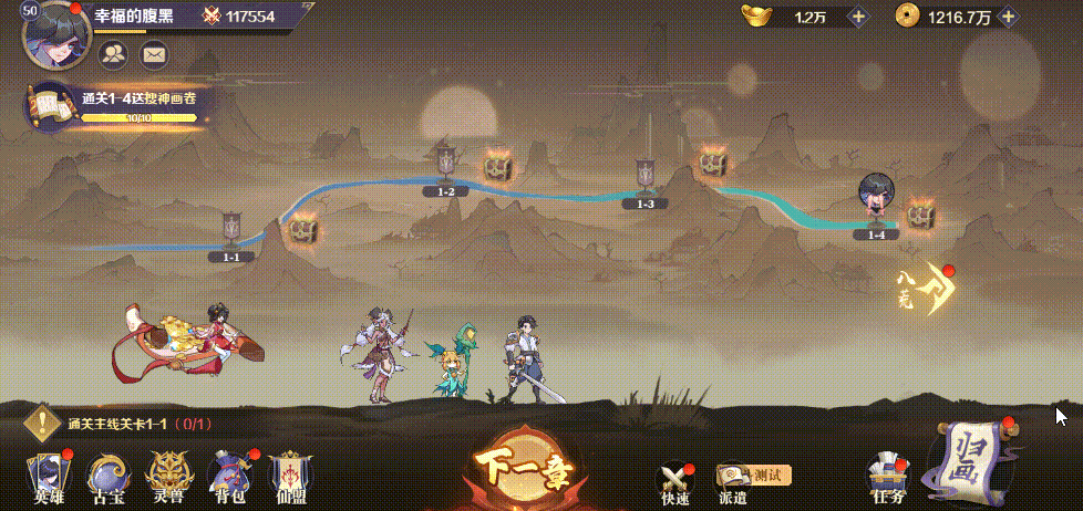 1、八荒探索队:各位上仙可以派出三位英雄为一队的探索队伍进入八荒,他们将会为大家搜寻八荒中的资源,而且随着队伍中英雄们的星级、品质提高,队伍还会为探索提供一定的加成哦。