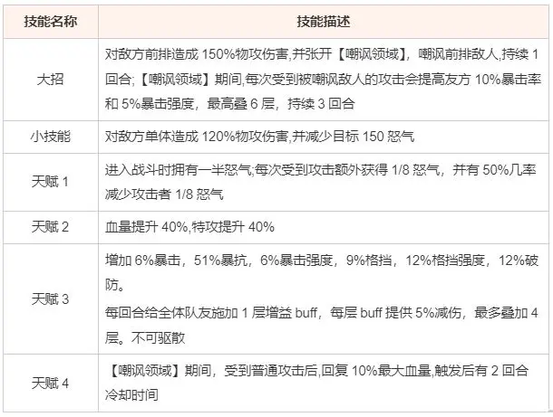 铁甲海龟是一位专注于防御和团队保护的草系SSR精灵。其重要的战术角色体现在其大招——【嘲讽领域】,能有效地控制前排敌人并为友方增加暴击率和暴击强度,从而提升团队攻击效率。小技能有能力削减敌人的怒气,进一步增强对敌人行动的控制。铁甲海龟天赋确保自身怒气的快速积聚并在战斗中减少敌人怒气,同时提供了显著的生命值和特攻提升,以及对团队持续的伤害减免效果。尤其通过天赋能够给队友带来护盾,进一步减少受到的伤害,提高团队的存活率。此外,当【嘲讽领域】激活中,它还可以在受到攻击后回复生命,加强了自身的持线能力。
