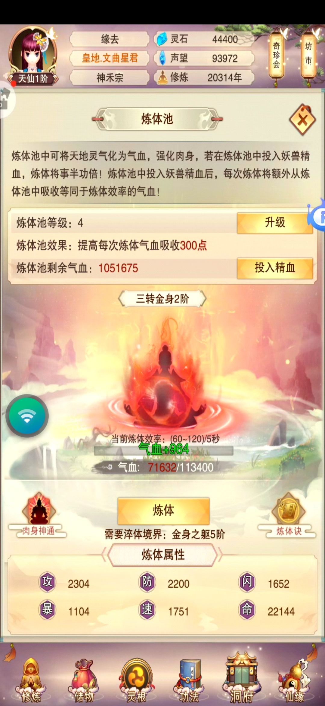 1. 主功能:炼体 入口:洞府-->仙居-->淬体池-->炼体