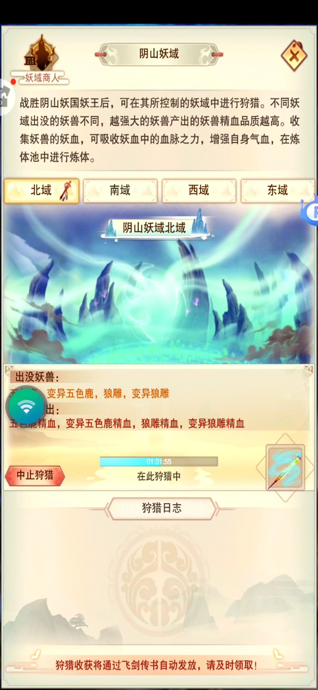 产出:可能获得普通精血、变异精血、草药、灵石、矿石、其它(待补充)、狩猎失败无收获。