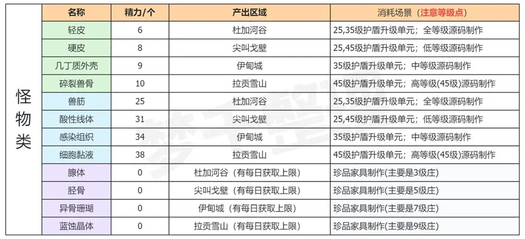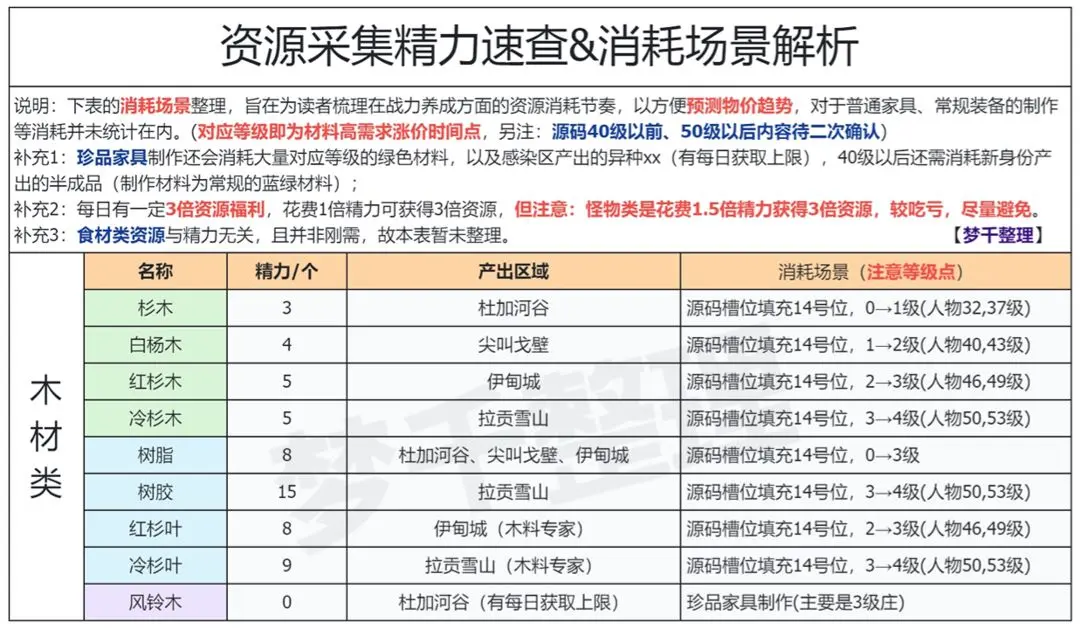 2.怪物资源的特点:优势-可以手动选取拾取物,而木材、矿类必须同时采集到蓝绿资源;劣势-每天的3倍资源尽量不要用在怪物上边,原因如表中所提到的,怪物类仅有2倍收益;