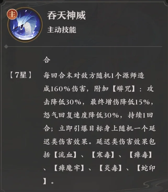 吞天蟒·散:吞天蟒造成伤害后,降低目标5%爆伤1回合。