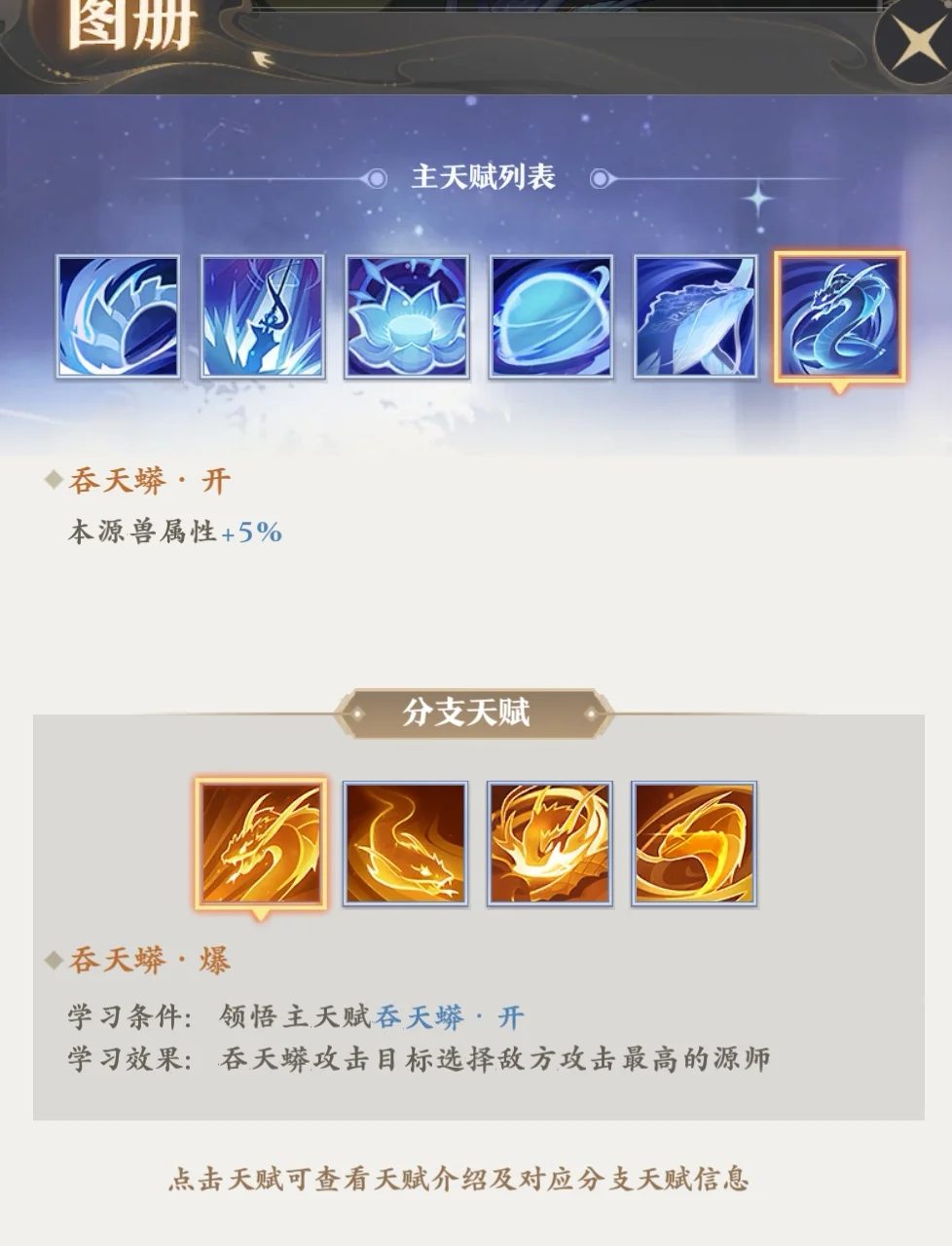 因为源兽天赋是4选2的机制,所以以上4条就只能选2条更合适的天赋。那么爆和阴这种2条互相冲突的天赋就只能选1条,因为不是每个人都是有彩鳞的阵容,并且彩鳞也不是每回合都能放出怒攻,所以让吞天蟒打攻击最高目标无疑是比打彩鳞目标实用很多。