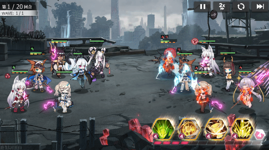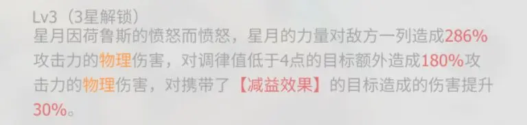 与普攻相同,都是对一列敌人造成伤害。0星的情况下伤害数值比较中规中矩,伤害并不是她登场的关键原因。
