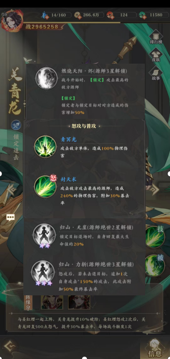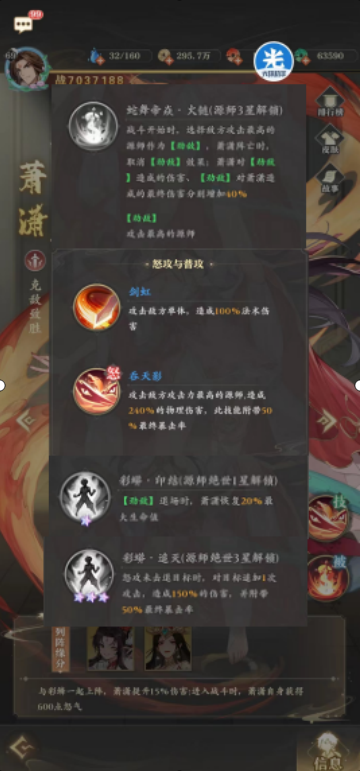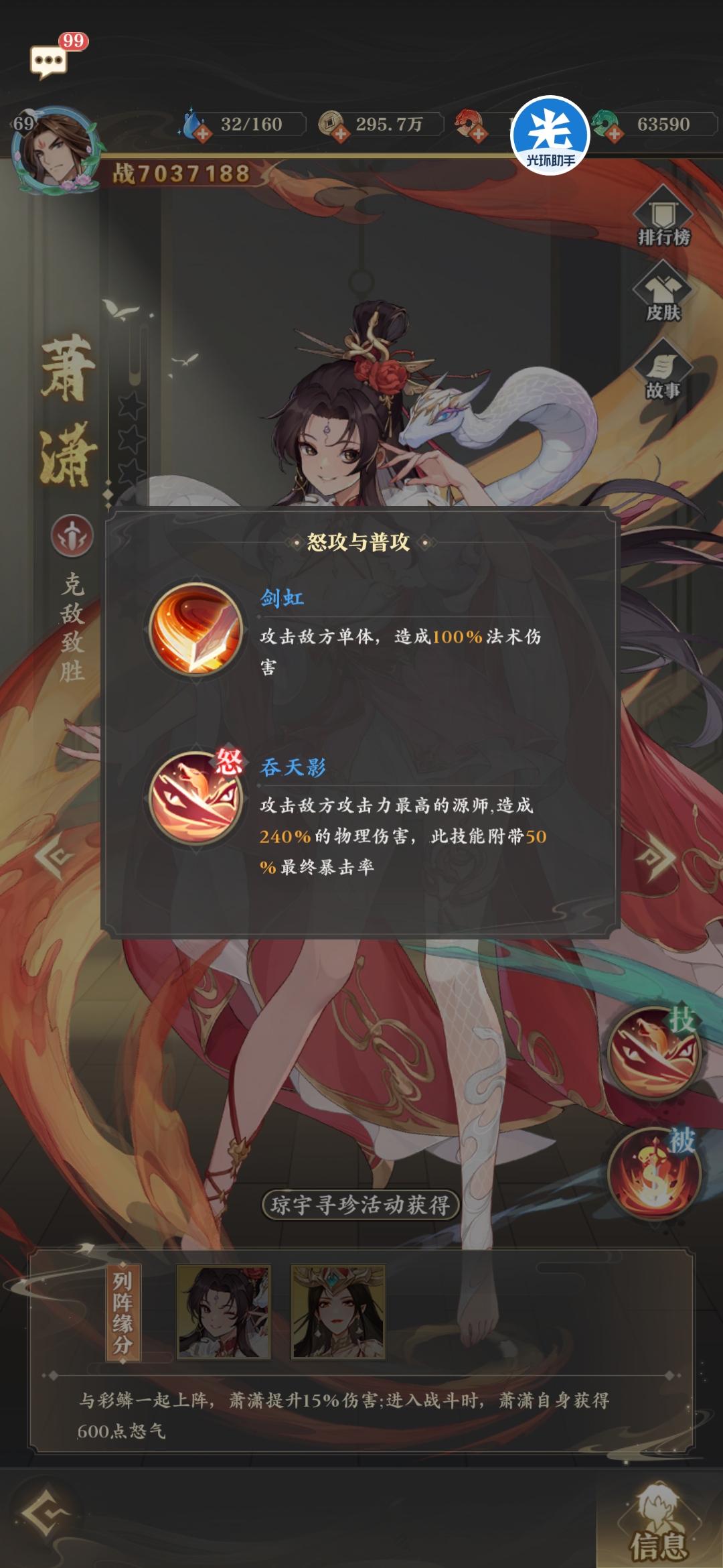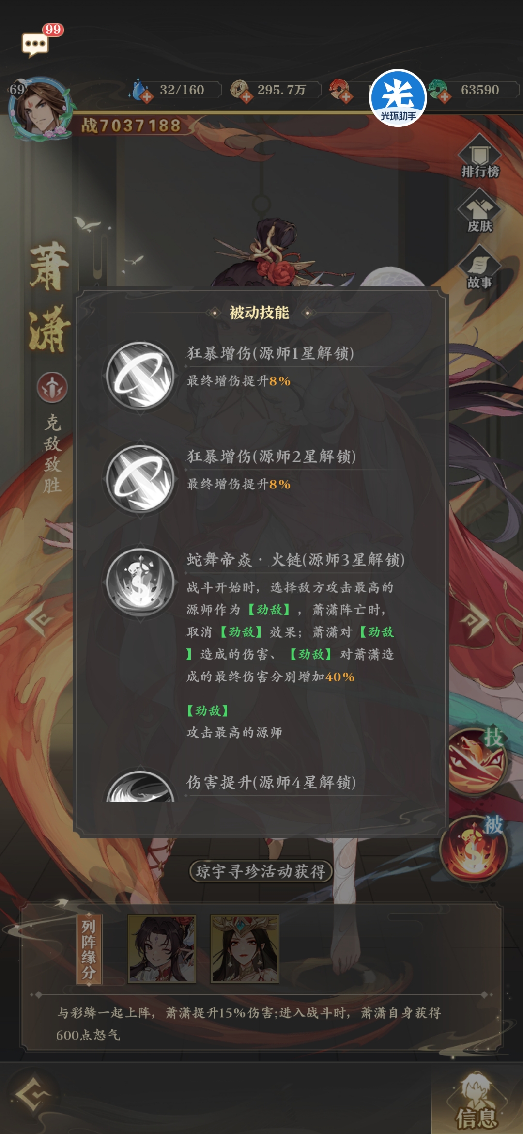与彩鳞一起上阵,自身+15%伤害,开场+600点怒气。