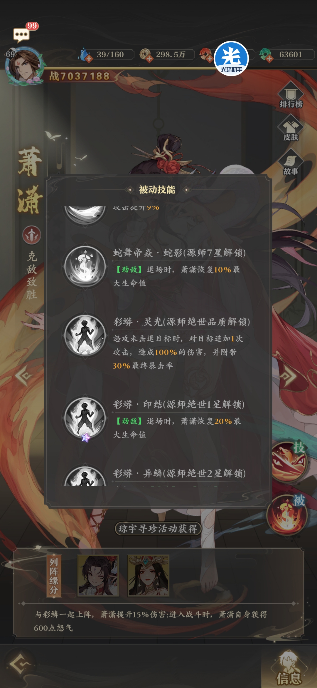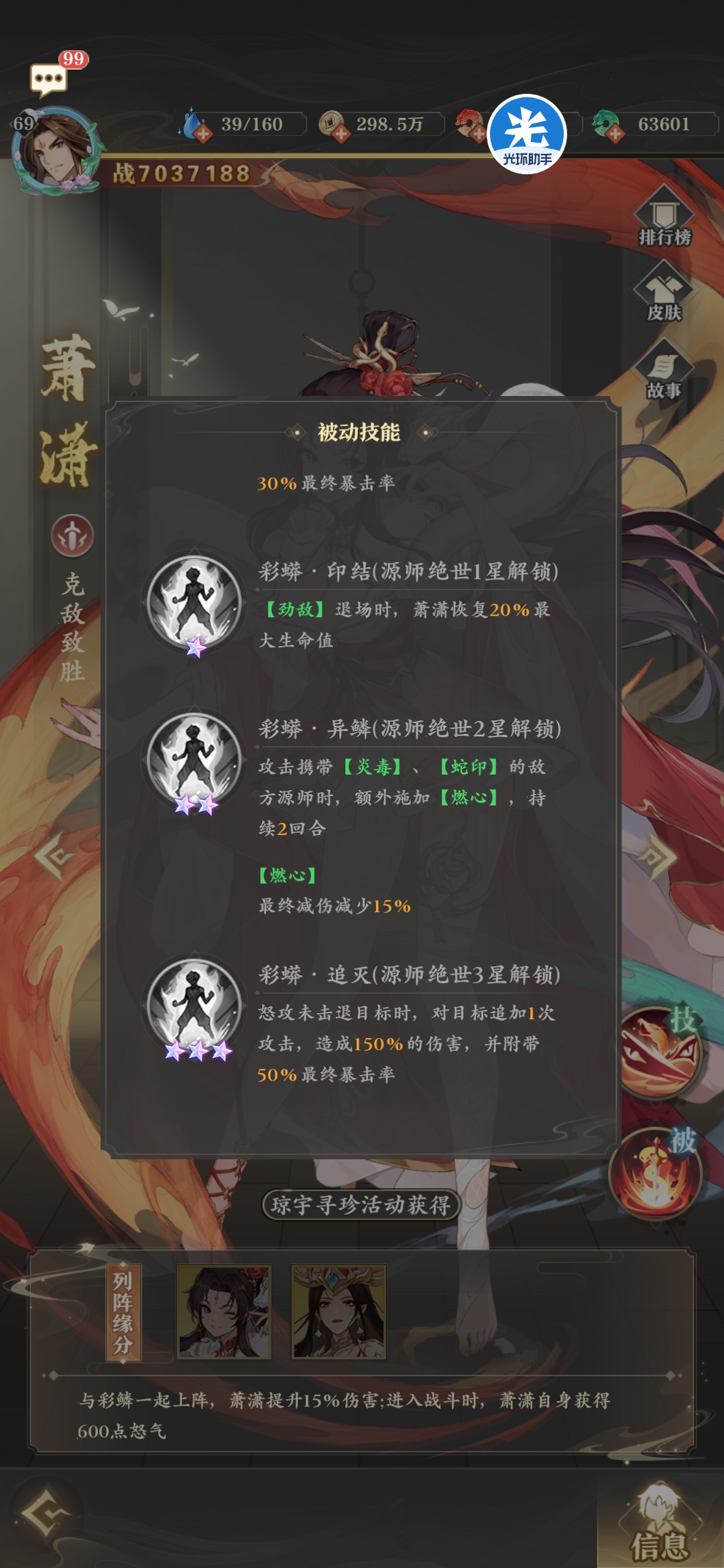 3星,开场时标记敌方攻击最高源师为【劲敌】,萧潇和【劲敌】互相攻击时+40%最终伤害。
