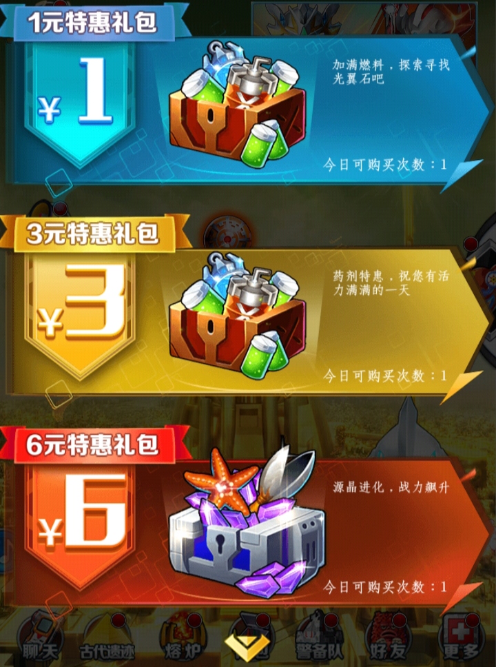 礼包:充值礼包对应金额领取礼包道具 无法领取单充道具
