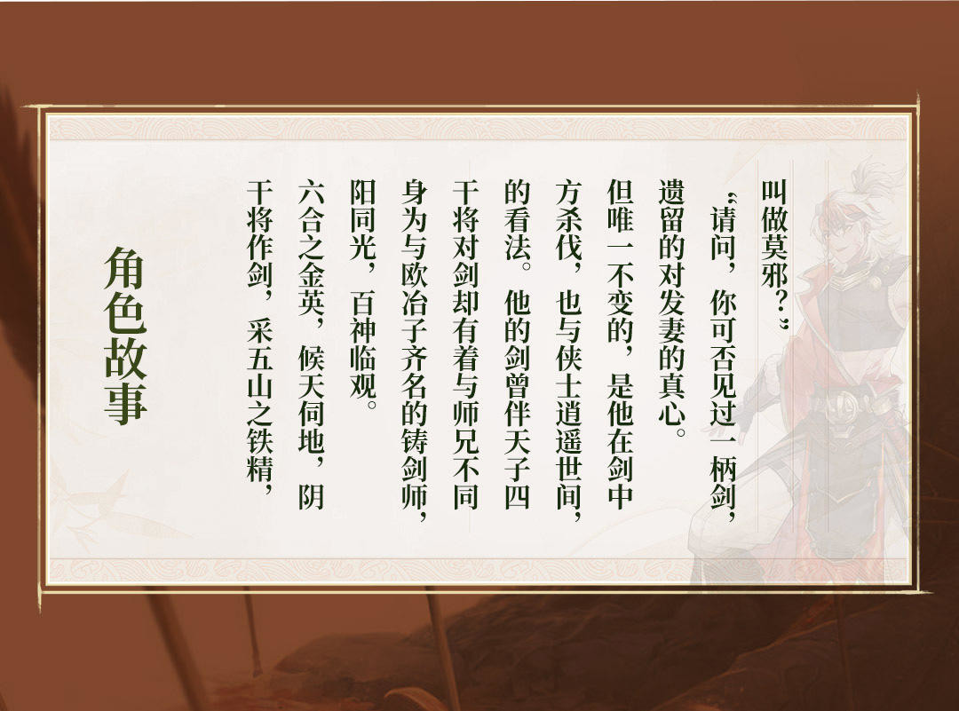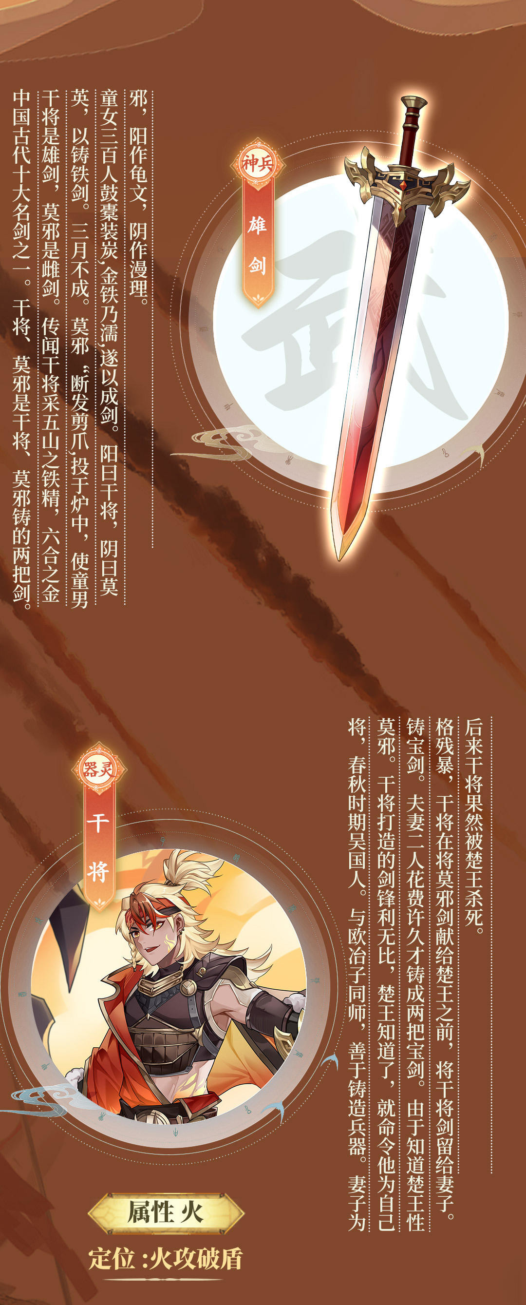 【器灵著录】雄剑·干将——纵使时间磨灭了万物,我的剑和传说也一定会流传下去勤勉搬运的后辈君发布于 2023-12-11关注干将作剑,采五山之铁精,六合之金英,候天伺地,阴阳同光,百神临观。身为与欧冶子齐名的铸剑师,干将对剑却有着与师兄不同的看法。他的剑曾伴天子四方杀伐,也与侠士逍遥世间,但唯一不变的,是他在剑中遗留的对发妻的真心。“请问,你可否见过一柄剑,叫做莫邪?”