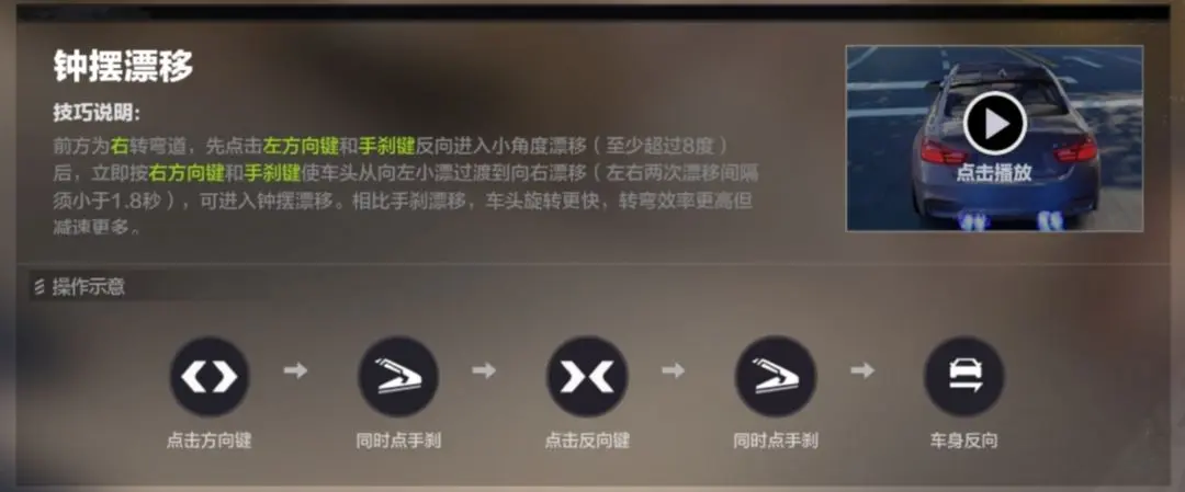 在半径较小的回头弯中,车手们可能会因为入弯速度过快而撞到弯道外侧墙壁,又或者普通漂移把控不当撞到弯心,这时候可就到了钟摆漂移的主场了。钟摆漂移能够让车辆保持一个恒定的旋转半径进行漂移,在回头弯中速度更快,精准度也更高,同时需要反打的角度也比较小而利于快速释放氮气技巧出弯。操作方法是,车手们在回头弯入弯前先向过弯的反方向进行一次小角度漂移,然后迅速反打方向并再次按下漂移按键,便能完成钟摆漂移。这个技巧相比正常漂移过回头弯稍快,但是对于操作熟练度要求更高,车手们可以在技巧练习中观看教学视频,更快掌握技巧哦。