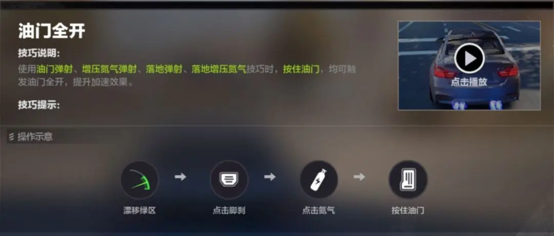 第二种进阶技巧是油门全开。车手们在使用弹射技巧、落地弹射技巧、增压氮气技巧、落地增压氮气技巧之后,我们也知道最后一个按下的按键是油门,此时我们可以长按油门来完成油门全开技巧,获得更强的基础动力加成。