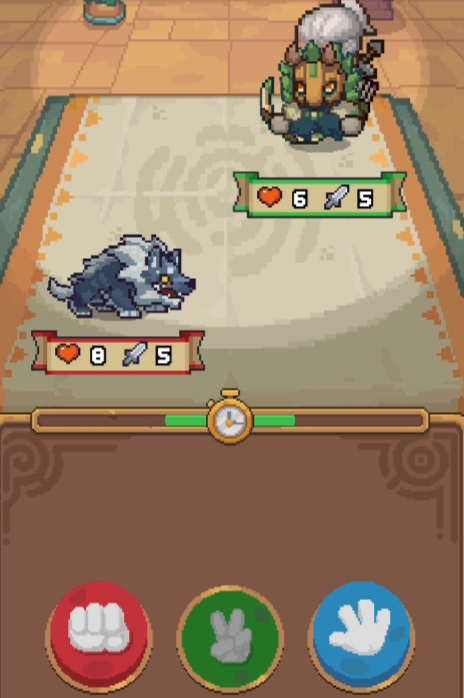 1:第一种情况:开局我们直接剪刀起手,如果对面出的也是剪刀,那么我们就是平局,这时候我们就往左边选石头,到这一步大几率都是赢的。赢的时候我们直接跳到最右边选择布。如果开局我们选的是生命9点以上的卡牌,我们第第二局就可以拿下了。