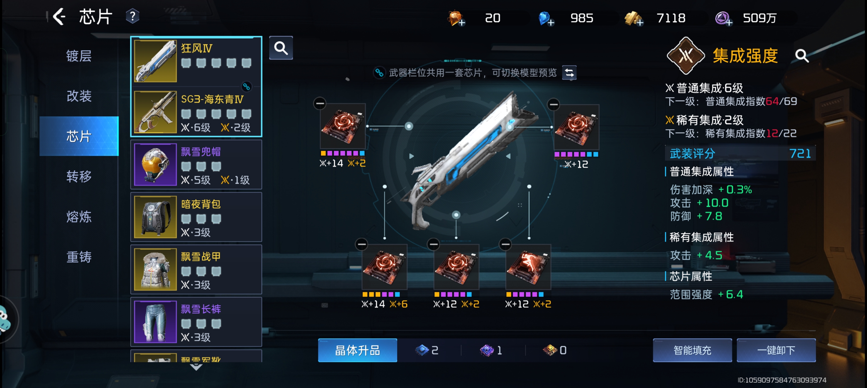 所以我们的金色芯山和紫色芯片优先装配给武器、鞋子、手套,来提升攻击力,剩下的蓝色芯片装配其他的部位。