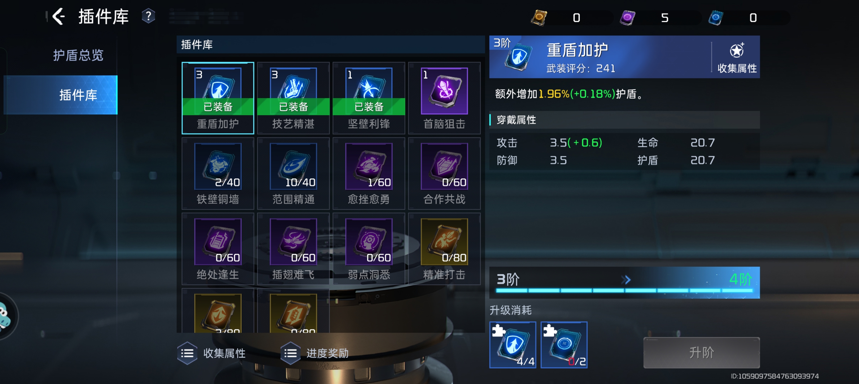 4:护盾—提升攻击力的方法。护盾推荐大家通用插件优先兑换蓝色插件和紫色插件,用来激活收集属性,提升攻击力,然后在考虑去进阶要用的插件。