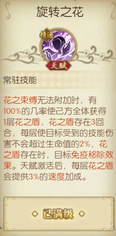 旋转之花是和之国罗宾主要的辅助天赋之一,花之盾的效果使得队友获得类似于锁血的效果,且可以免疫移除,每层花之盾还提供3%的速度加成,是一个非常全面而好用的辅助天赋。
