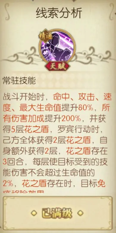 线索分析也是和之国罗宾最主要的辅助天赋之一:战斗开始时自身增加高额的命中、攻击、速度、最大生命值以及伤害加成,并获得五层花之盾;和之国罗宾行动时为队友附加两层花之盾,使得队友获得锁血以及免移除。