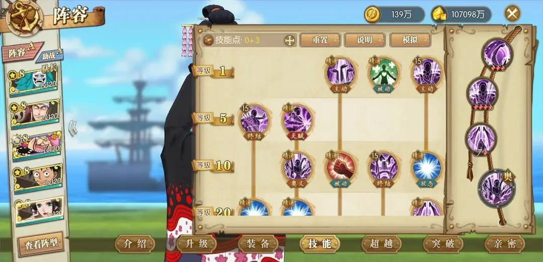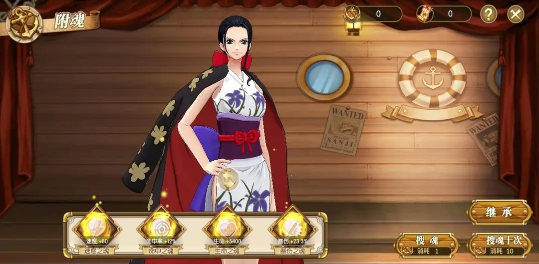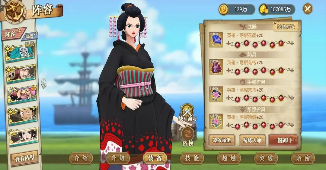 在PVP中和之国罗宾搭配三主动一奥义,7魂玉的万紫千红·巨大树·打击用来打乱敌方阵型,使得和之国路飞可以对位到对方关键人物;巨大树·掌刮用来清空目标魂玉和怒气。