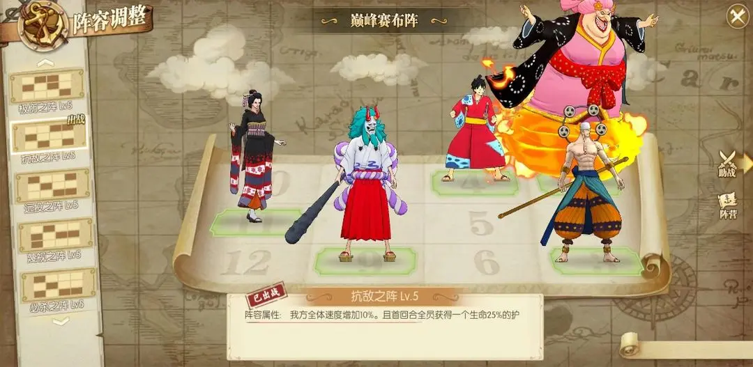 整套阵容一速和之国路飞携带单体奥义快速进入奥义延展状态,可以快速解决UR花魁阿玲的护盾;二速的和之国罗宾打出控制效果并为己方提供花之盾的保护效果;三速大和释放终结鸣镝接奥义雷鸣八卦为己方UR花魁阿玲提供加速效果,UR花魁阿玲此时出手可以有效压制敌方血量;二三回合由和之国路飞打出巨额伤害带走对方UR花魁阿玲取得胜利。