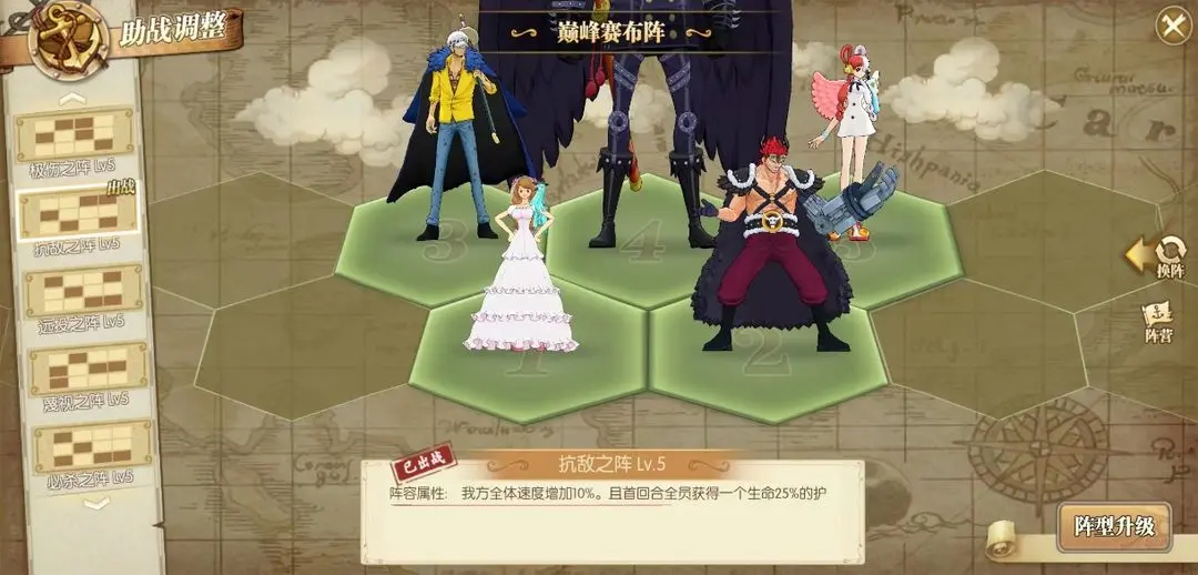 阵容解析:总体来说这套阵容相对稳定,容错率高。前排觉醒艾尼路作用很大:首先觉醒艾尼路可以为队友加速,自身也有着不错的生存能力;其次可以麻痹敌人让敌人丧失出手机会,变相保护队友;最重要的作用是前排的觉醒艾尼路可以抵挡和之国路飞的巨额伤害,从而保护我方UR花魁阿玲,为战局的胜负提供了强有力的保障。