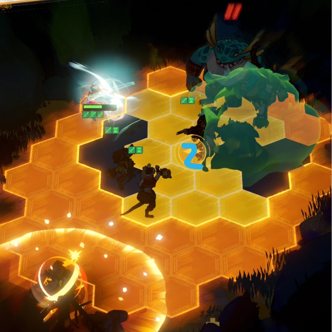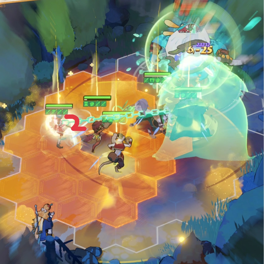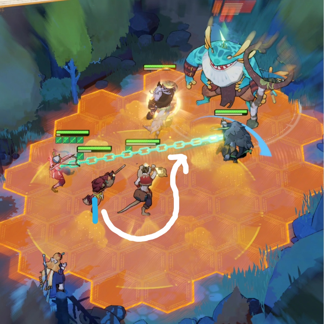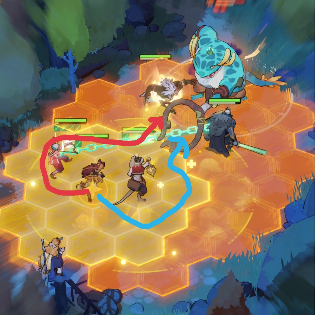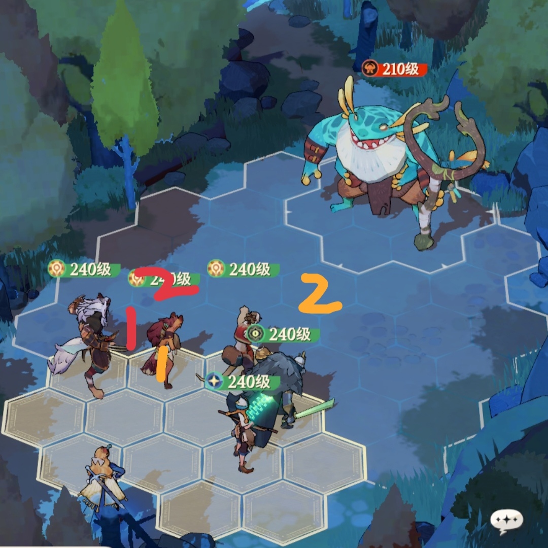 这是狼人第一次放大场景的截图,他跳到数字1的位置,也就是阿德的位置,把阿德往前顶了一格,使阿德可以进狼人的buff圈,然后走白色路线回到boss身边。