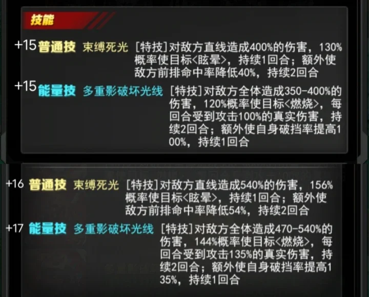 +17 能量技多重影破坏光线[特技]对敌方全体造成470-540%的伤害,144%概率使目标<燃烧>,每