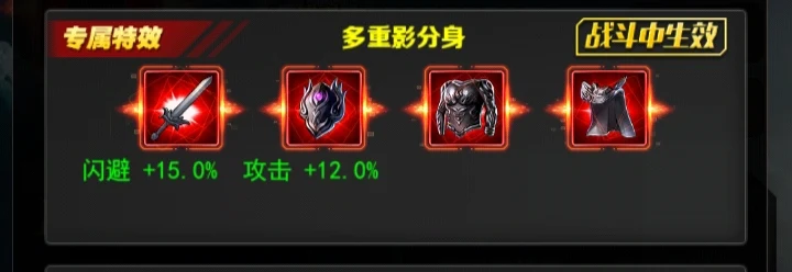 +7 巴尔坦影分身 自身行动时,闪避率+50%,持续1回合。每当自身闪避时,闪避率+15%