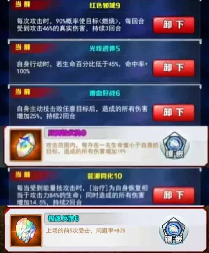 解析:每当自身闪避时,对敌方造成低比例伤害使敌方目标的受伤率增加25%,持续一回合,还有一个高效的随机移民角色混乱,这个效果是很不错的,搭配上自身自带的眩晕效果可以打出双重控制效果,让自身打输出的力度更大一点。但是如果都免疫的话,那就很难受