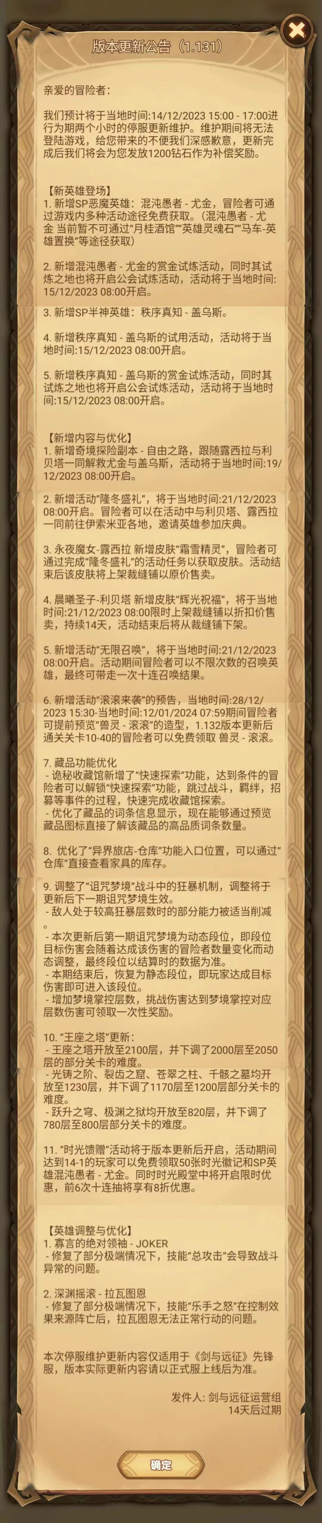 新增混沌愚者-尤金的赏金试炼活动,同时其试炼之地也将开启公会试炼活动,活动将于当地时间:15/12/2023 08:00开启。