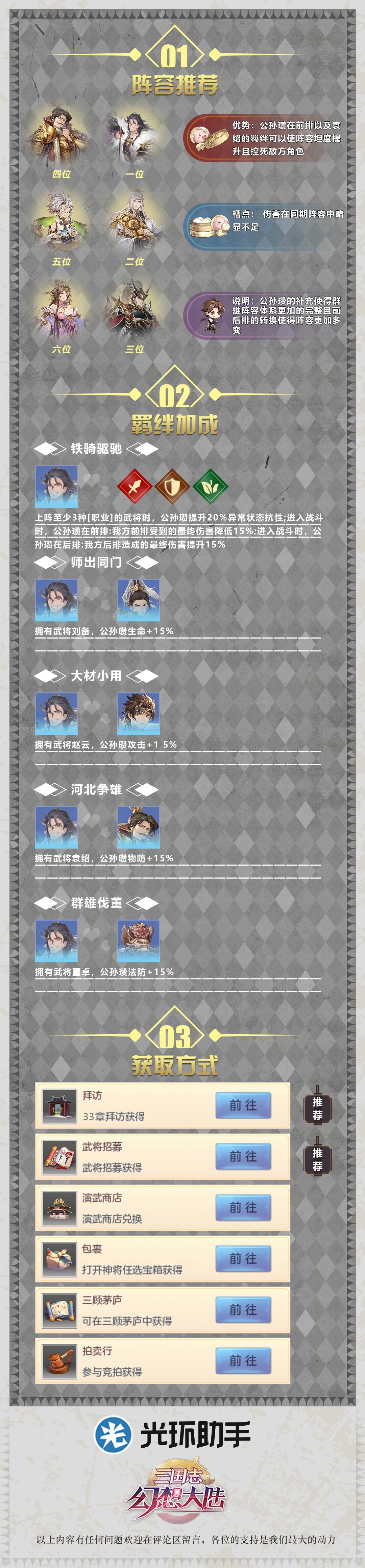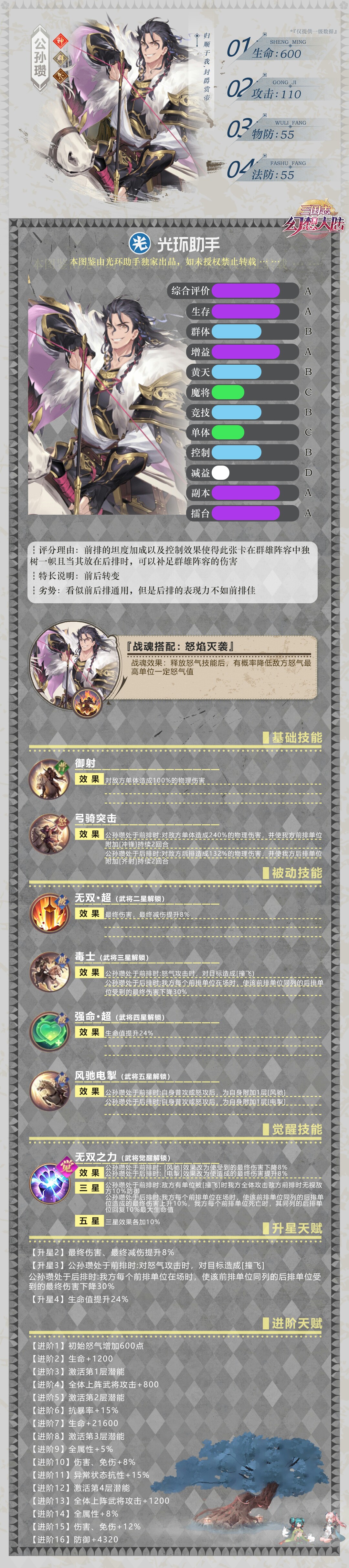 【光环独家】公孙瓒分析和图鉴光环-盒子发布于 2020-10-21关注 公孙瓒双形态虚有其表 文案背后的乌托邦 公孙瓒自打更新之后 各类分析讨论层出不穷 “双形态”一词似乎已经成为了公孙瓒的最大卖点 我已经记不太清第一次“双形态”这个词的出处了 究竟是玩家还是官方 有些难以查证 不过近期在官方的公众号中 官方确 浅谈公孙瓒的定位——后排篇 前情提要在之前的文章里,也是通过一系列的分析给大家讲解了策划眼中的公孙瓒,而身为第一张双形态的卡,是否后排形态的公孙瓒就没有作用了呢?本期就给大家带来公孙瓒后排的攻略 羁绊/属性分析首先是羁绊方面,自 浅谈公孙瓒的定位——前排篇 前言嗯,这篇帖子其实很早就准备了,但是一直拖到今天(别问,被拖更王传染了)。而就在今天,我自己也是拿到了公孙瓒做了一些简单的实测,下面就来给大家分析一下这张在贴吧被吹上天和贬到底的卡,真实情况到底如何 公孙瓒浅析(机制、战魂、阵容) 公孙瓒浅析 ——阳崽出品 在最新一次爆料中,三国志幻想大陆推出了两位全新的神将——鲁肃和公孙瓒,这两位武将都拥有着全新不同的机制。那么接下来,就让阳崽来为大家浅析一下,各自机制的不同点。 公孙瓒——白 切后福音公孙瓒?史上最强挂件来袭 尽管说公孙瓒在前排与后排都有着不错的技能,但还是出现了我之前预想的情况:公孙瓒绝大多数被放置于后排并且和孙尚香成了绑定。 可以说这类情况十个里面占了八个。 那么在实际的巅峰对决中,公孙瓒的回合数大多是 未经授权不得转载使用。10月21日更新