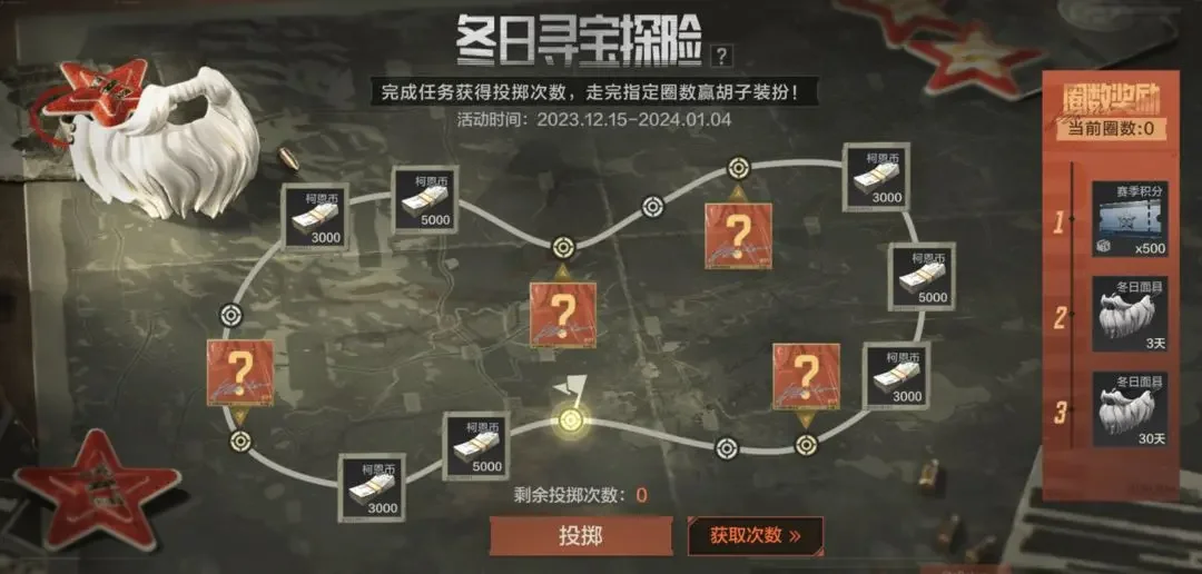 活动界面点击【获取次数】完成指定任务即可获得投掷次数,完成对应圈数即可获得对应奖励,快来获取你的冬日寻宝限定面具吧!