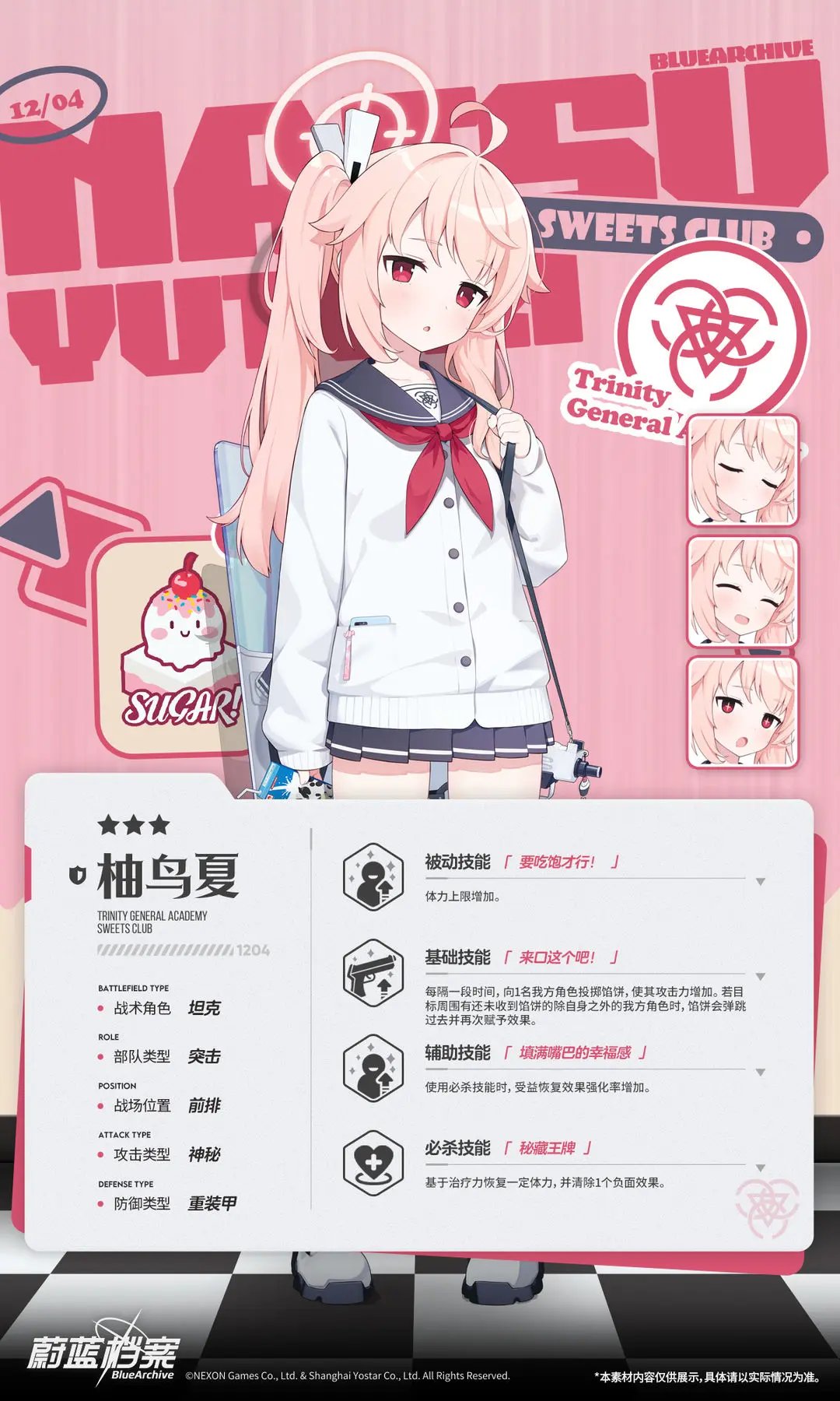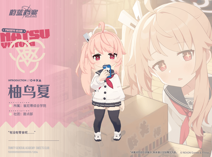 【新增人物档案】柚鸟夏光环资讯 - 二次元发布于 2023-12-16关注 //////////档案启封//////////■ 柚鸟夏崔尼蒂甜点部的一员,惹是生非第一名,却自称为浪漫主义者。会莫名其妙地说出一些有哲理的话,凡事都喜欢用甜点来打比方。每当她说出天马行空的话时,周围的人都会觉得很尴尬 ,但其实她只是单纯地想和大家一起分享浪漫而已。由于她对“浪漫”的定义总是不断变化,因此在旁人看来,所有人都被夏搞得晕头转向。“不管什么话题都可以,我想跟老师聊更多更多~”