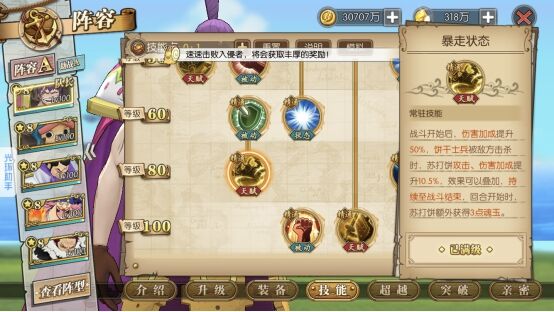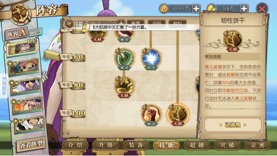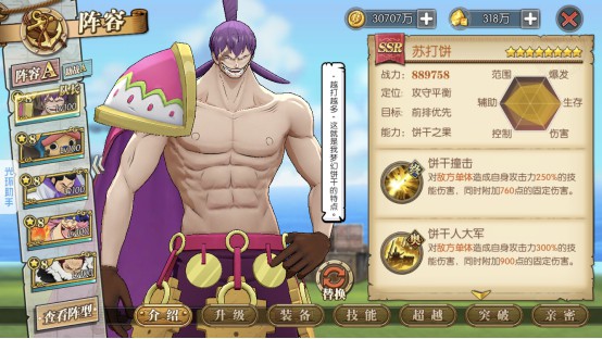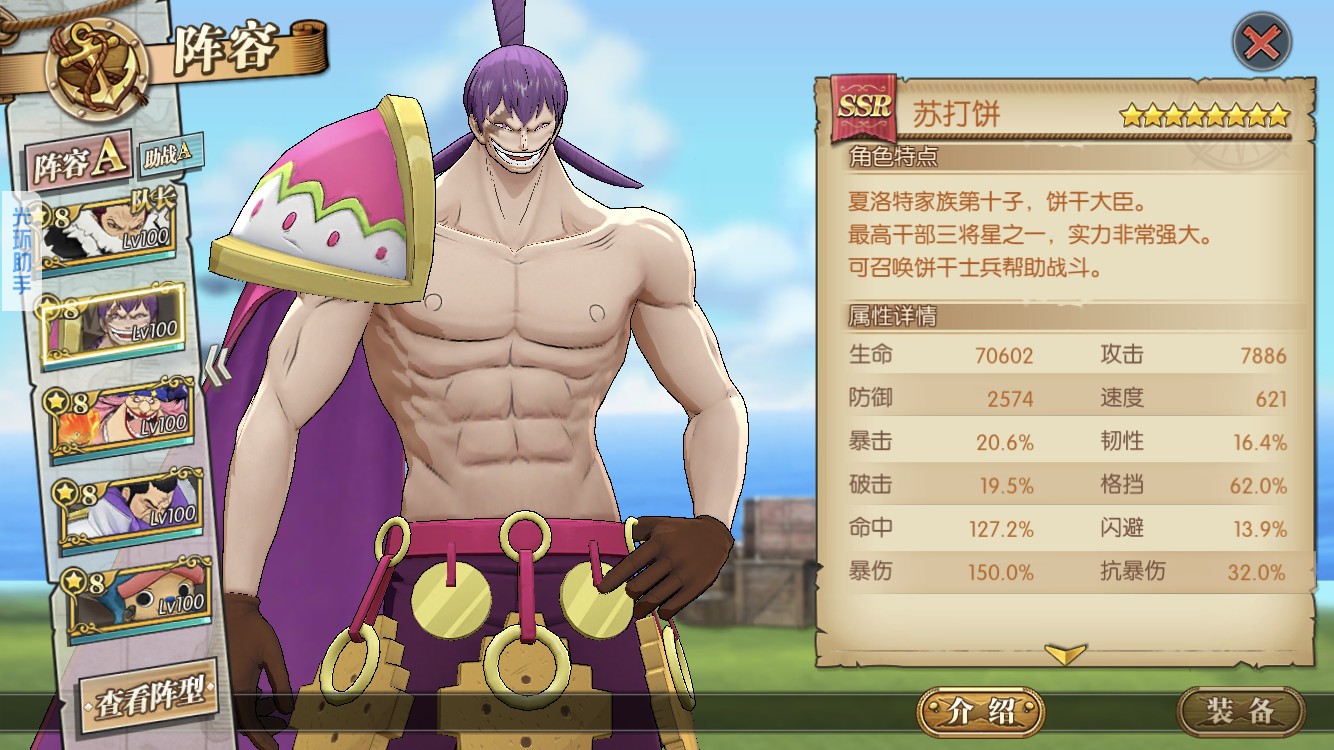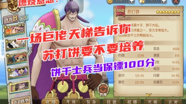 从苏打饼的技能被动看出,苏打饼的被动以输出为主的。但也能即可攻退可守的攻守兼备人物,奥义延展后分别附加增伤和减伤效果的延展主动技能,让我们根据天梯情况进行调整打法。不过这里只要是苏打饼的回血问题,他只能靠奥义回血,自身不能像大妈或卡二行动后进行自我回血,自我生存环境要靠团队来补充,输出上有大妈在压制所以在天梯中不能看出苏打饼的输出伤害,若你转换到主线上,你可以发现苏打饼跟山治、锦卫门一样,输出伤害杠杠的。