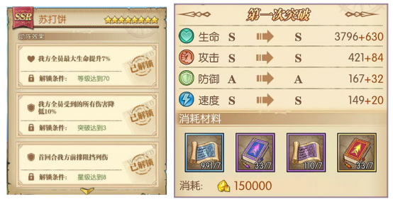 为苏打饼提高伤害,并饼干士兵被击杀,苏打饼的攻击与伤害加成提高10.5%,持续至战斗结束。一般来说,高培养下饼干士兵很难被击杀,基本是残血状态,如遇到80%血以下的卡二,才有几率被击杀来提高苏打饼的伤害。