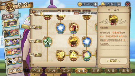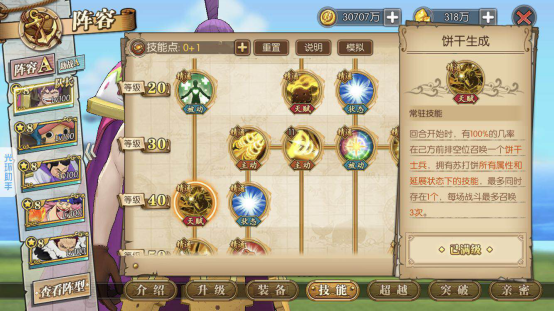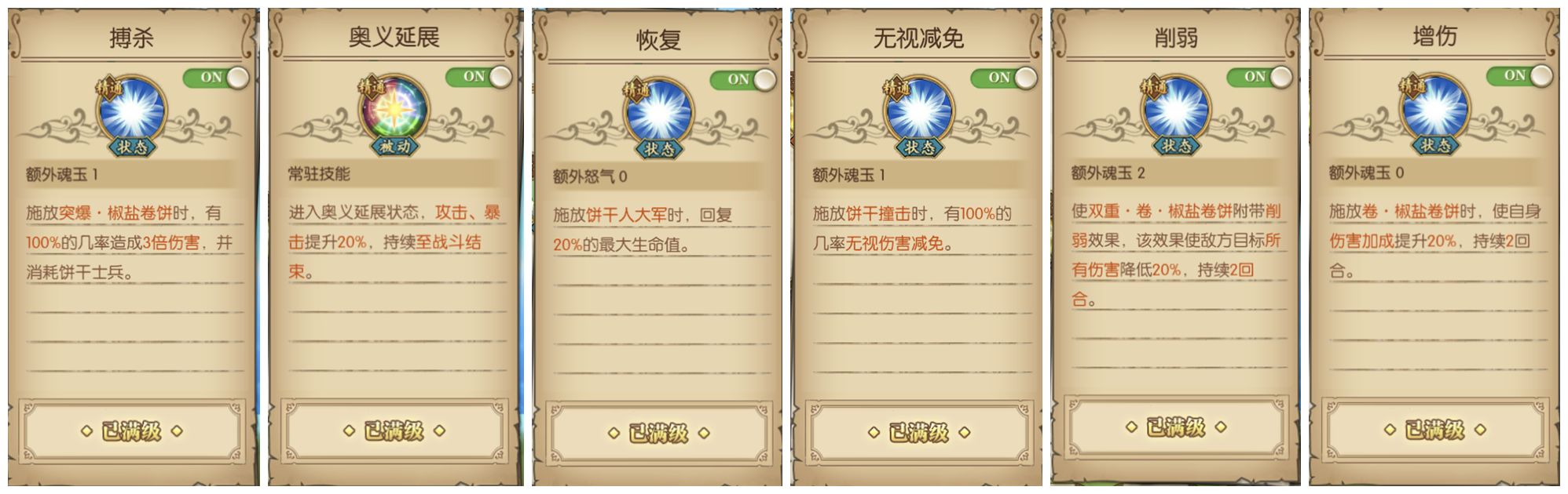 苏打饼核心天赋,饼干士兵获得苏打饼所有属性和延展状态下的技能,最多同时存在1个,每场战斗最多召唤3次。不过饼干士兵是能吃所有的控制技能与不良状态。饼干士兵被控制不是很重要,本体被控制不能出手就很麻烦一件事,所以这里乔巴解控与苏打饼被打解控几率很关键。