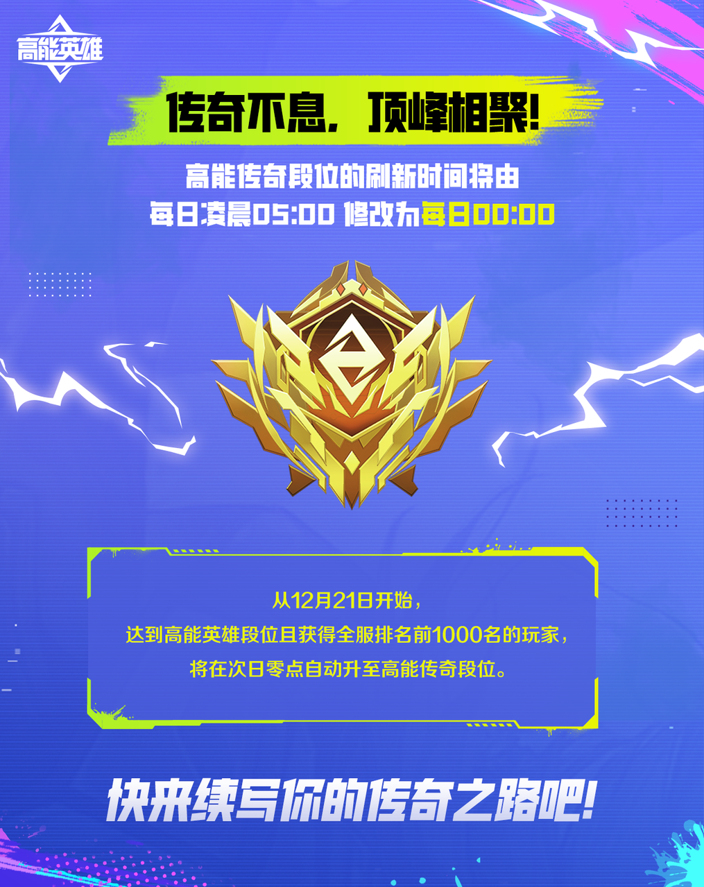 「高能传奇」段位刷新时间更新!光环小G发布于 2023-12-18关注亲爱的高能玩家们:高能传奇段位的刷新时间将由【每日凌晨05:00】修改为【每日00:00】。从12月21日开始,达到高能英雄段位且获得全服排名前1000名的玩家,将在次日零点自动升至高能传奇段位。请高能玩家们留意,祝您上分顺利!《高能英雄》运营团队 2023年12月18日