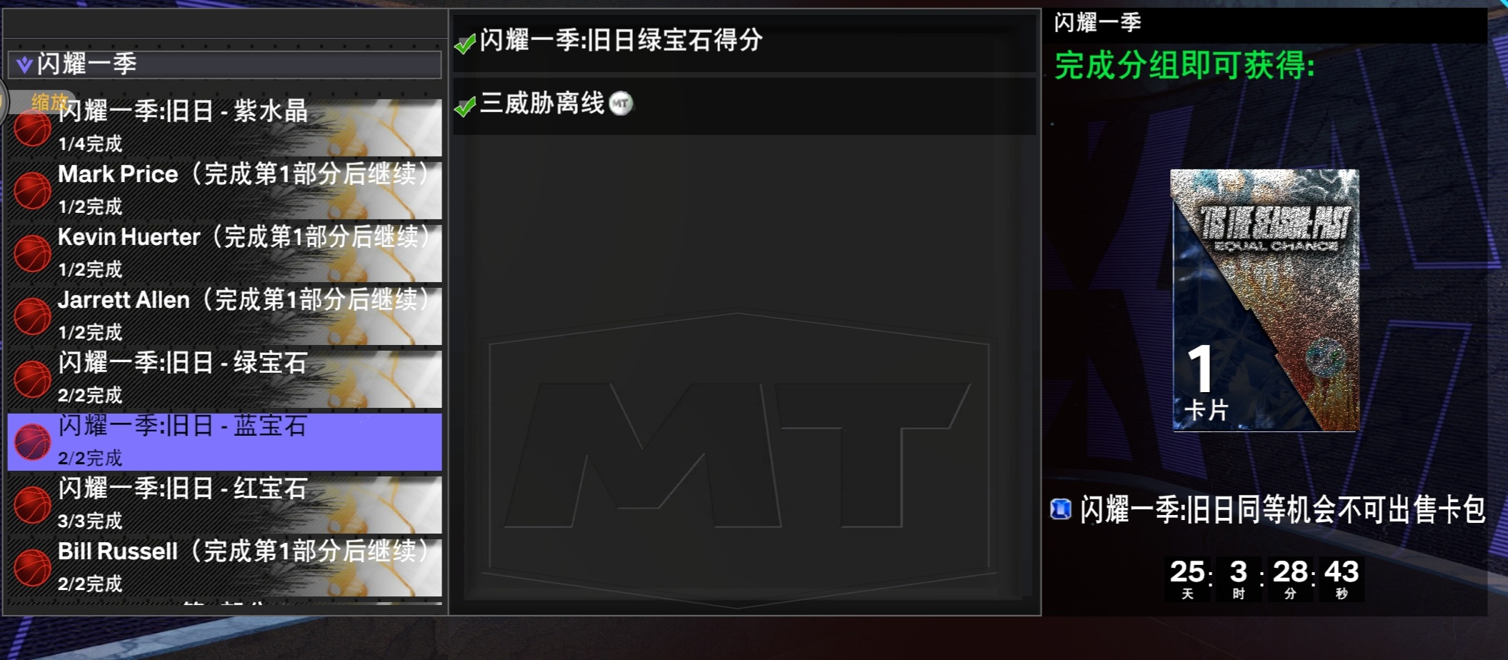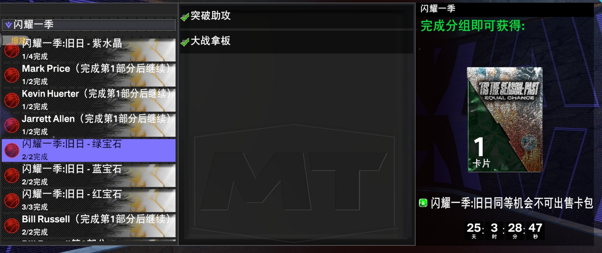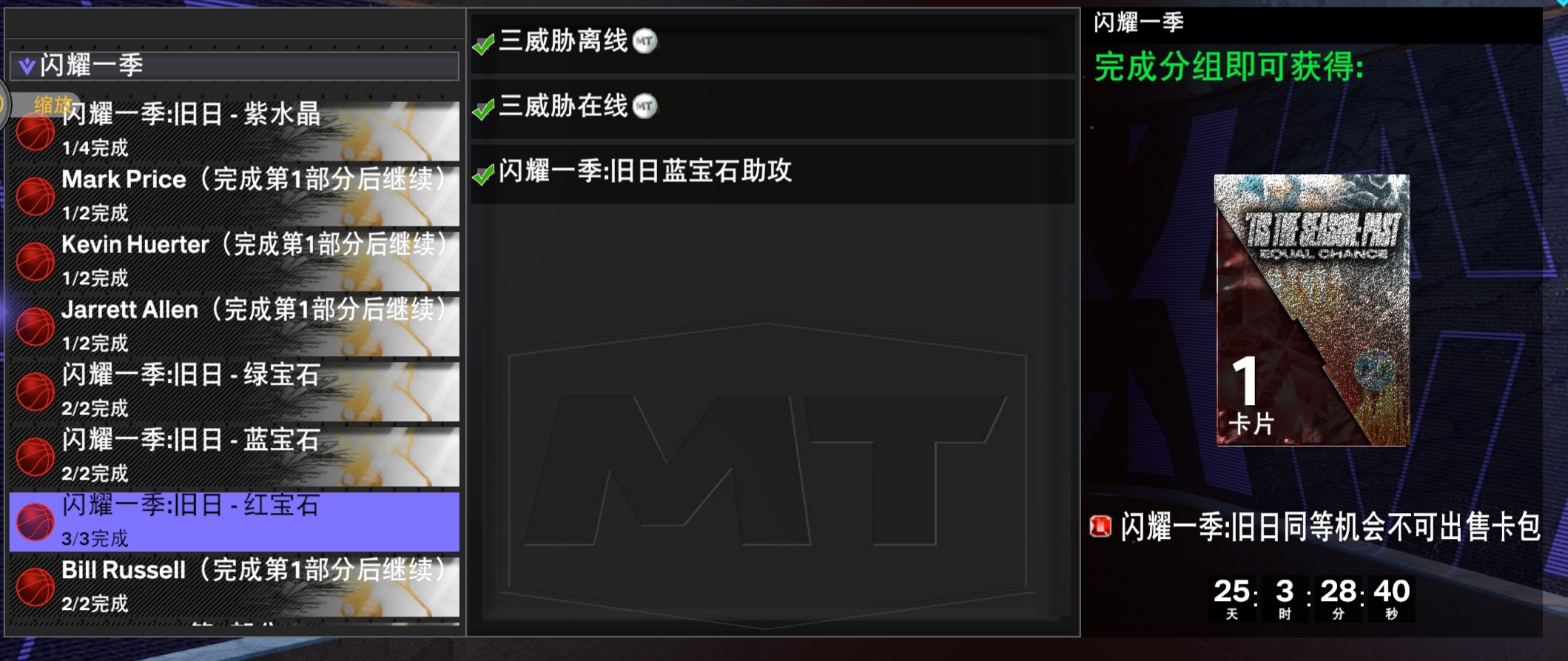 tips:这个任务就稍微有门槛了,首先 6 名 NBA 锦标赛大战 就是一笔大概 7w多 MT 币的开支,这里建议大家去离线三威胁中将 110 胜 和130 胜 的奖励选项卡包拿到手,可以省下 2w5 MT 币的费用呢。其次就是在线比赛 7 个三分,这个就得看网络条件了,没办法呀;最后 10 名 25 周年纪念奖励球员,建议 3 张好卡带 10 个能力值好点的 25 周年纪念奖励球员(黄金) 然后去打 半职业临时挑战快点;至于什么是 25 周年纪念奖励球员?答:当然是赛季通行证给的奖励球员。