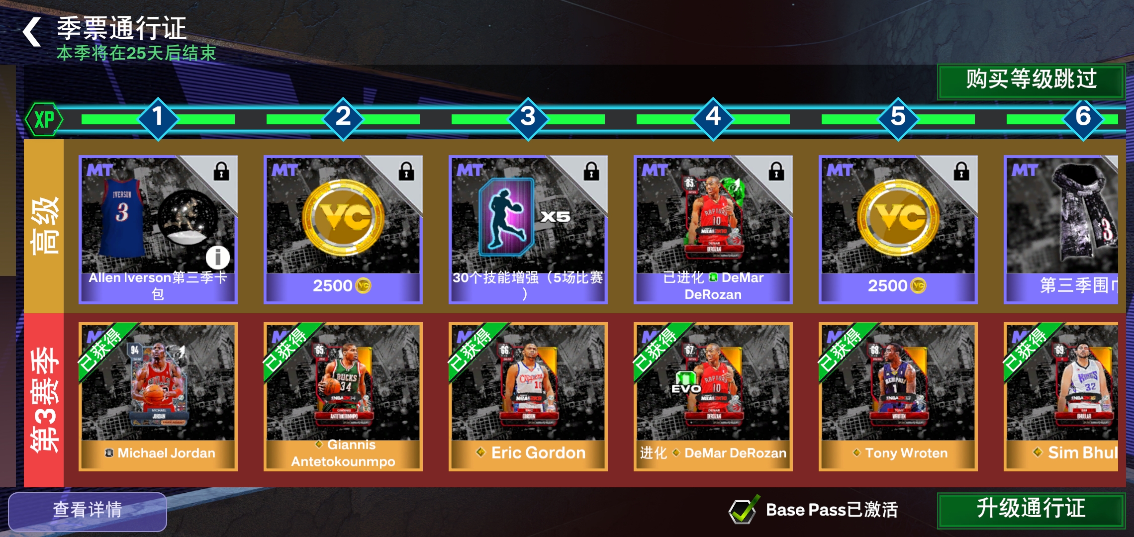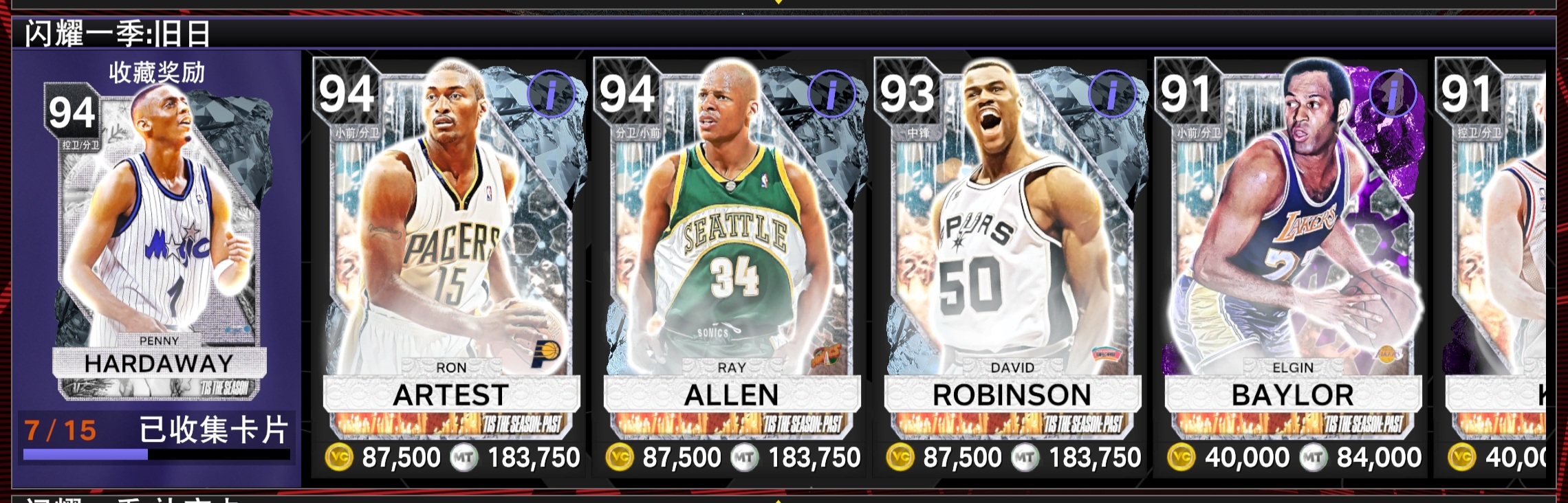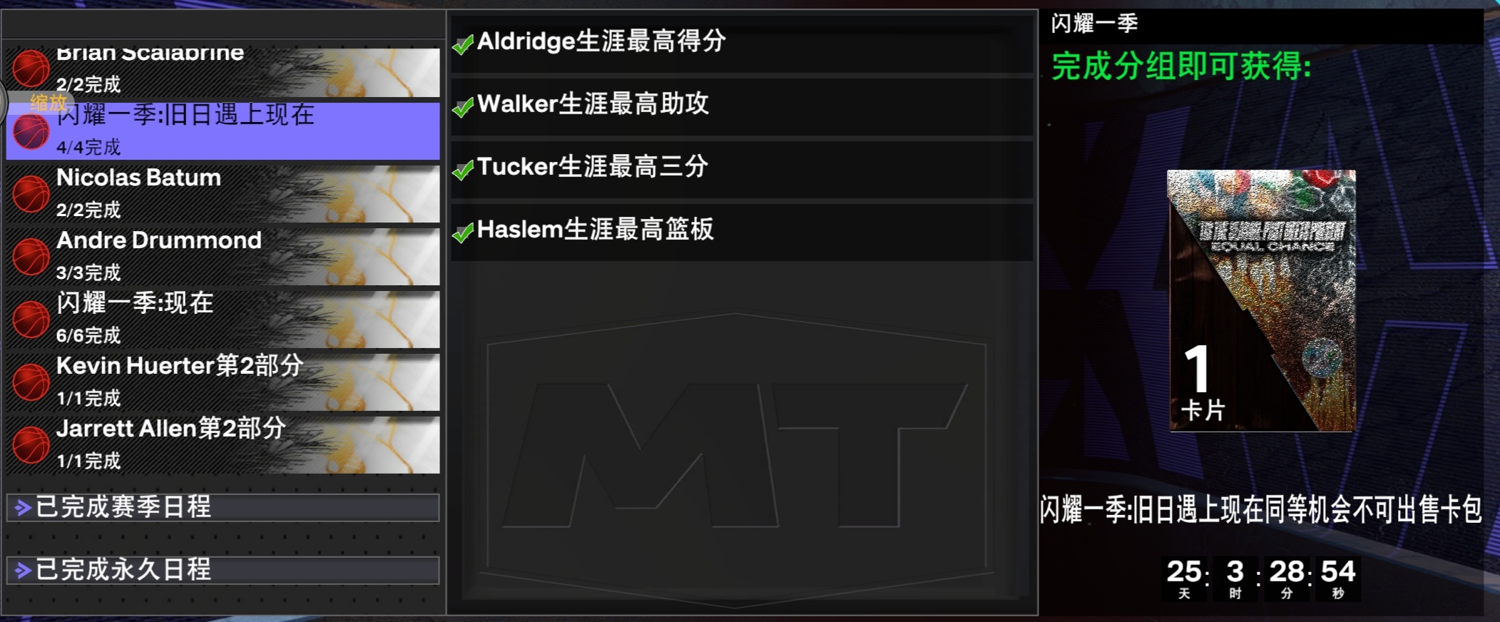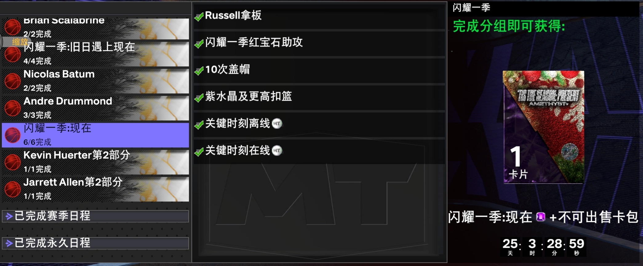 tips:这个任务就稍微有门槛了,首先 6 名 NBA 锦标赛大战 就是一笔大概 7w多 MT 币的开支,这里建议大家去离线三威胁中将 110 胜 和130 胜 的奖励选项卡包拿到手,可以省下 2w5 MT 币的费用呢。其次就是在线比赛 7 个三分,这个就得看网络条件了,没办法呀;最后 10 名 25 周年纪念奖励球员,建议 3 张好卡带 10 个能力值好点的 25 周年纪念奖励球员(黄金) 然后去打 半职业临时挑战快点;至于什么是 25 周年纪念奖励球员?答:当然是赛季通行证给的奖励球员。