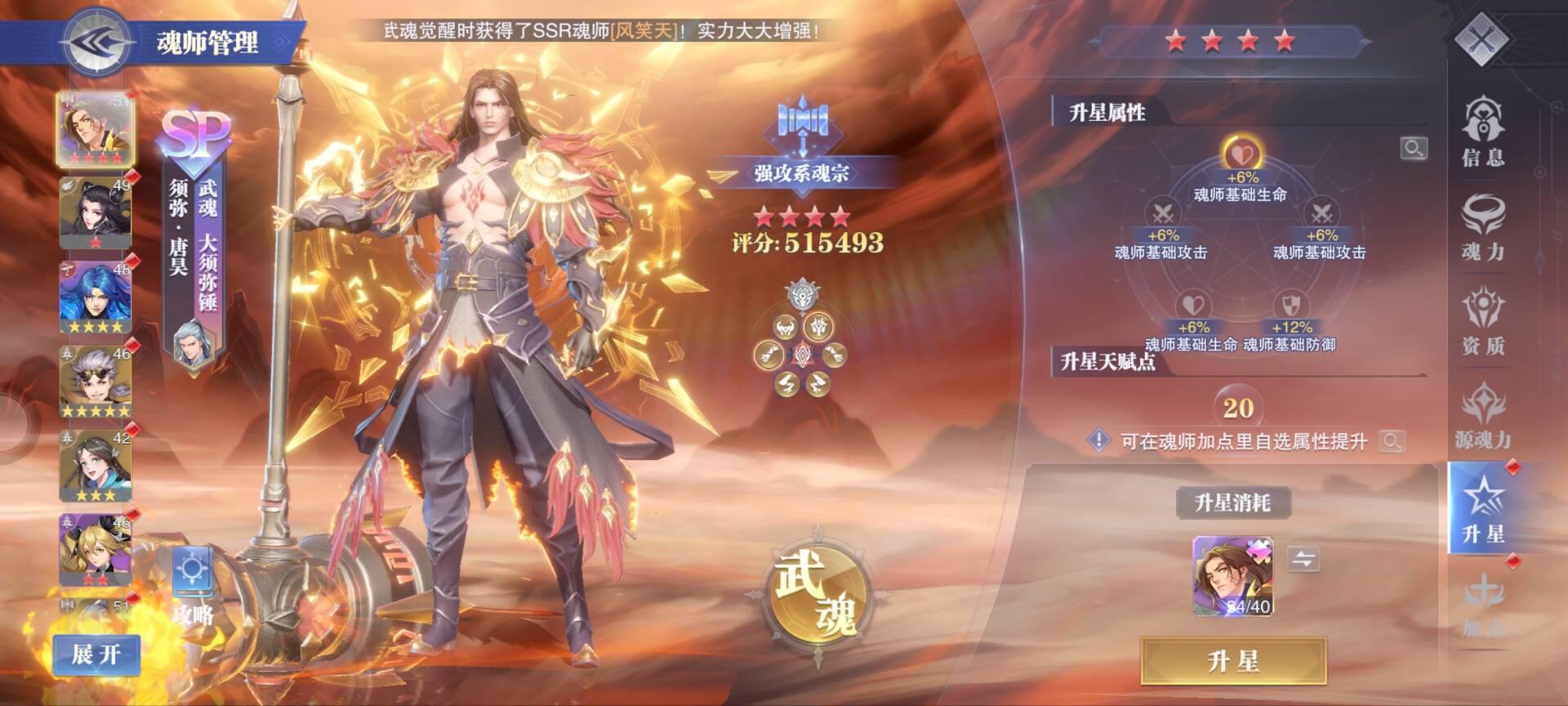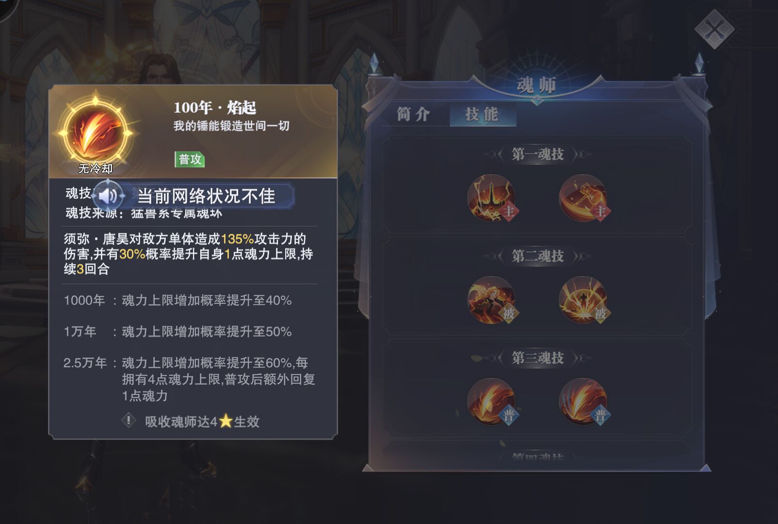 ③唐昊的第三魂技名为【焰起】。3-1效果是对敌人造成伤害,并且提升魂力上限。