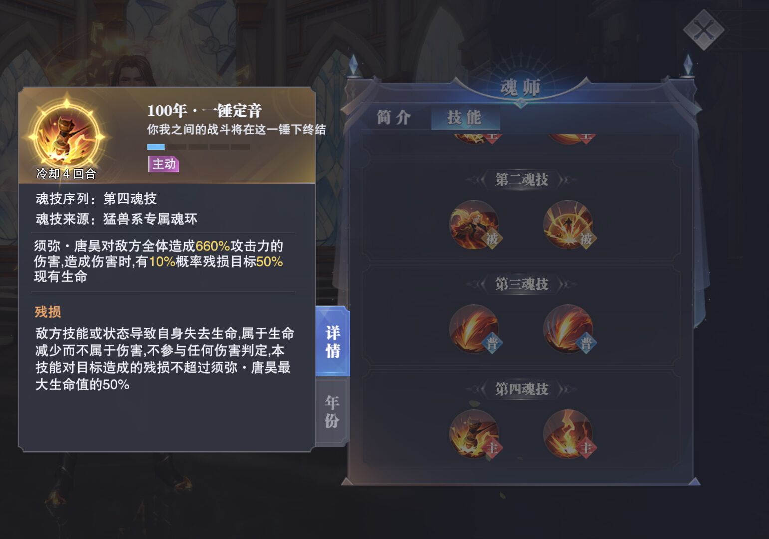 ④唐昊的第四魂技名为【一锤定音】。4-1魂技效果是全体伤害+有几率直接残损目标50%的生命。