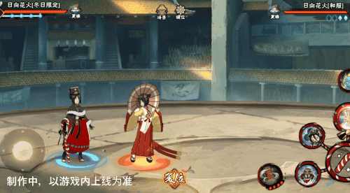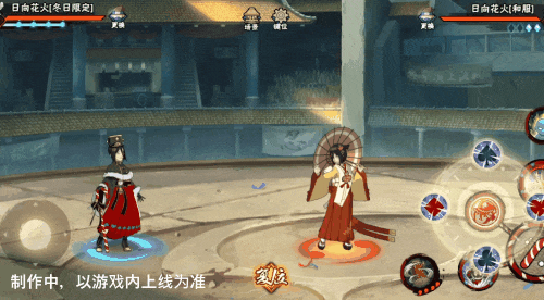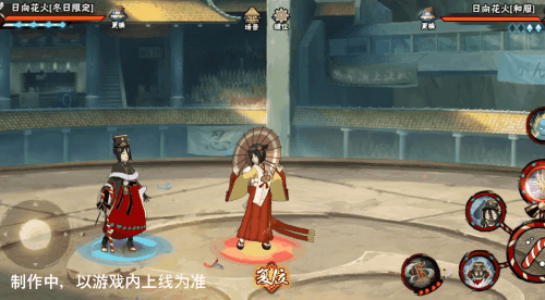 冬日花火身上散发红色查克拉,在冬日场景下快乐奔跑不断撞击对手,随后环绕对手高速转圈并不断点穴攻击,最后滑到一旁,被点穴的对手浑身散发七彩的光芒浮在空中,随后爆发出四种花色的图案。