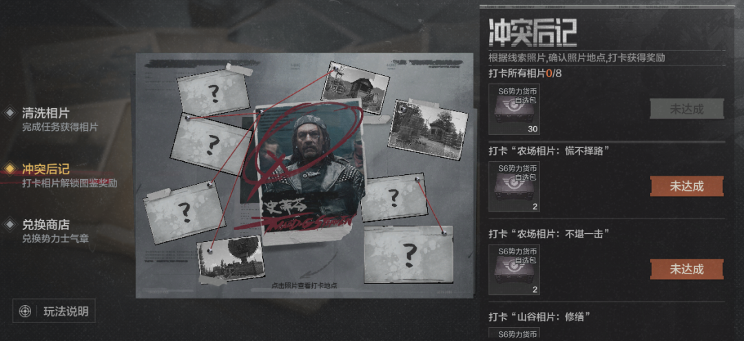 根据获得相片后可以查看相片的具体详情和方位,携带相片前往所在的地图方位进行打卡,指定相片将被消耗;完成打卡后在【冲突后记】活动界面中领取对应打卡奖励。