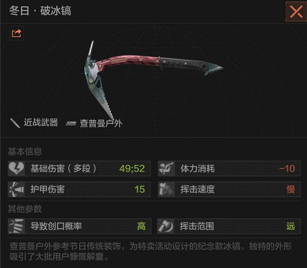 冬日冰镐是一把颇有分量的锐器,偏慢的攻击速度带来的是两段高额基础伤害,在充分发挥长手柄距离优势的情况下,只需一个照面就能放倒敌人。