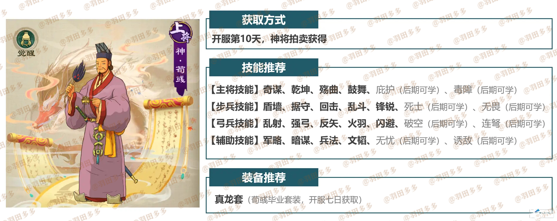 总体而言,神荀彧也是推荐各位争取的神将。即便没有真龙套,肉度也可客观,只是缺乏了远程阶段的伤害输出能力。当然,如果你有真龙套,但缺少了一个给真龙套的最佳衣架子,那么荀彧就是最佳的选择。需要注意的是,荀彧也有缺点,过于低的武力和统率,他学不了霸体、诱敌、识破。【诱敌】需要 90 统率才能学习,而在游戏中后期,【诱敌】几乎是所有武将都必学的技能。因此神荀彧获取后,也需要大量的堆砌统率。