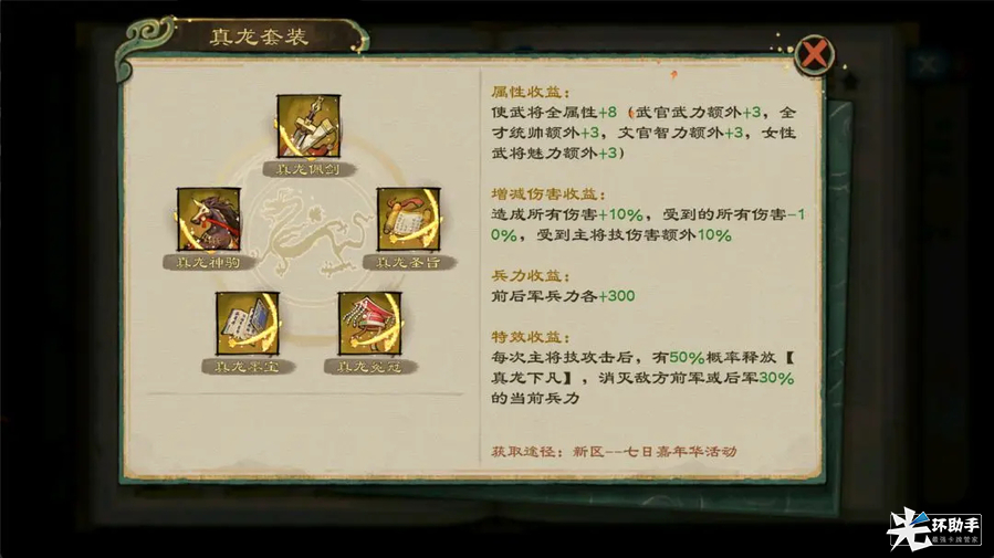 游戏里的宝物和装备很多,新区开服七日嘉年华累充活动可以获得真龙套,真龙套带来了不错的属性加成,可以使武将全属性 +8 ,武关/全才/文官/女性武将,再次基础上还可以再获得额外的 3 点对应的属性,举个例子: