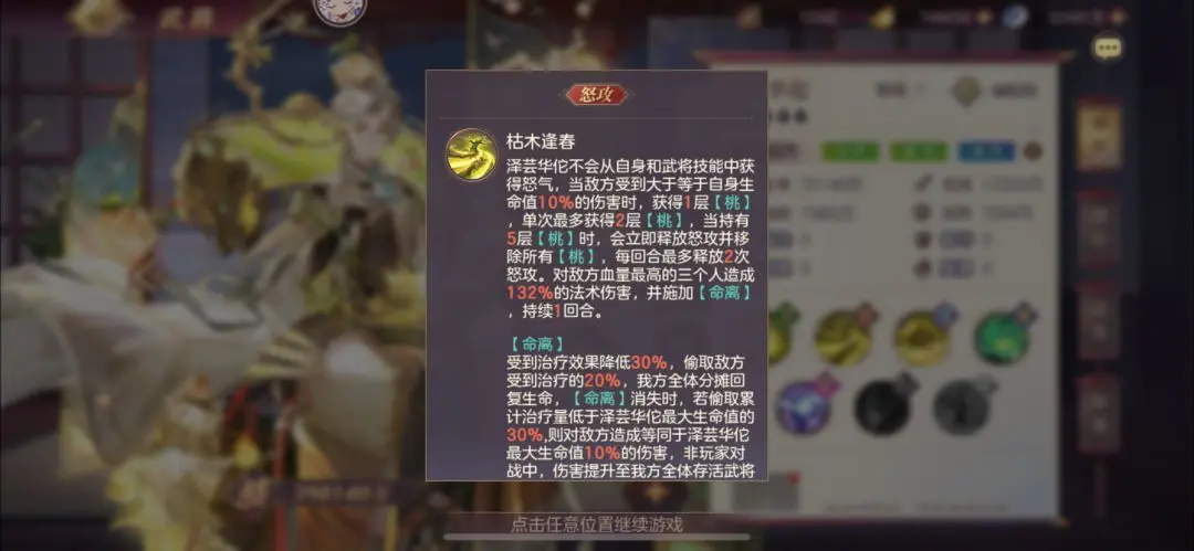 泽芸华佗的怒攻脱离了常规的怒气体系,消耗专用资源“桃”进行释放,这是的他对冰封等控制的抵抗效果非常好,怒攻施加的“命离”不仅可以让对方治疗量打折扣,更能斗转星移,转化对方治疗为己用。