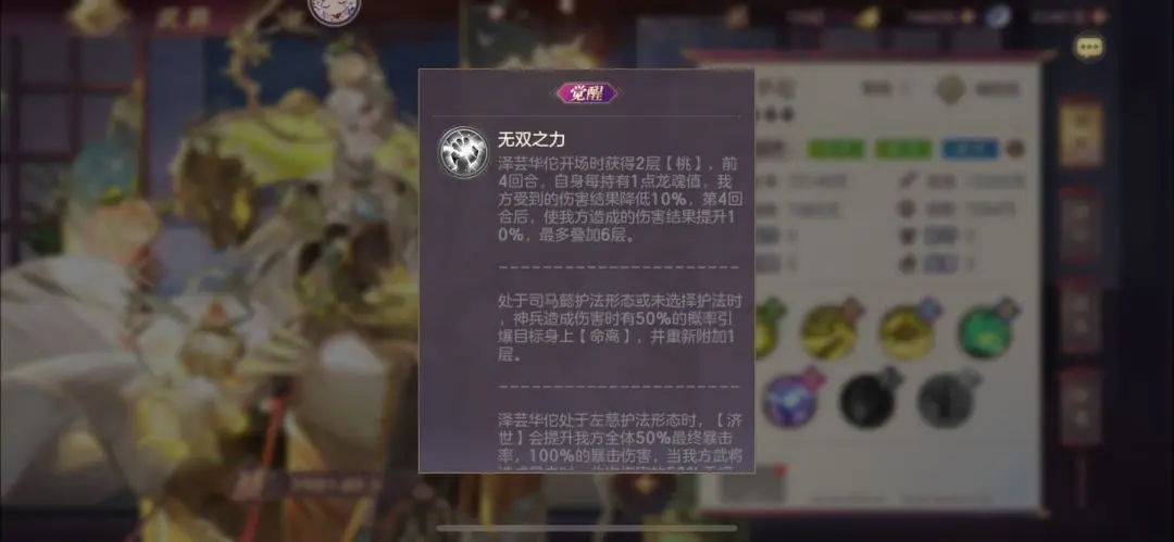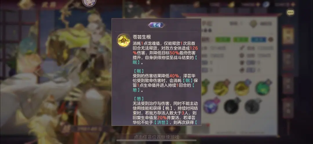 又一个一次性龙魂技。现在龙魂技越来越有变主动为被动的趋势了。华佗在第二回合稳定开出龙魂技并获得强大的免死buff“眠”,处于该状态下的华佗不仅大幅度减少自身受到的伤害,还能在濒死时获得复活机会,同时还能让对方全体武将输出大幅下降,50%最终伤害的减少颇为不俗。