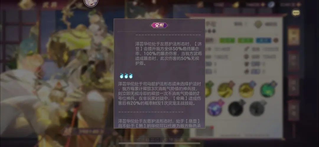 略微提高华佗的启动速度,开局赠送俩桃。除此之外更大的作用是将多余龙魂值进行利用,由于华佗普攻还带有额外获取龙魂值的被动,且龙魂技仅仅消耗1点龙魂值,所以华佗龙魂值叠加速度还是不错的,该被动提供的效果为前守后攻,主打一个防守反击,数值上最高能达60%伤害结果影响,可圈可点,唯一的遗憾是前期效果还是比较一般,缺少爆发获取龙魂值的天赋。