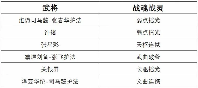 武将:诳诡司马懿-张春华护法、许褚(命魂觉醒+专武)、张星彩(命魂觉醒+专武)、凛煜刘备-张飞护法、关银屏(专武)、泽芸华佗-司马懿护法