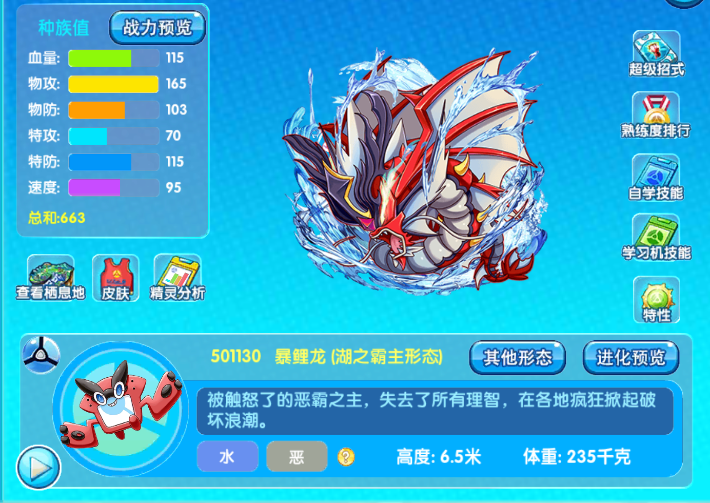 技能搭配赖场输出流:龙之舞、替身、狂怒撕咬、暴怒龙卷风,性格:开朗,努力值:速度物攻,道具:专属红色鱼鳞、剩饭,特性:自信满满(测试服的特性,但不排除正式服上线的可能性)威压凝视