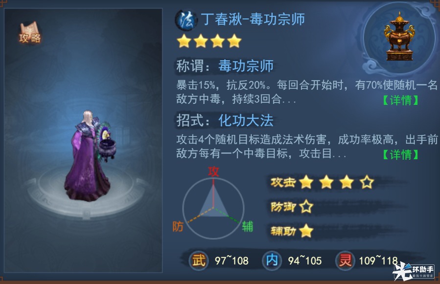 被动效果:暴击15%,抗反20%。每回合开始时,有70%使随机一名敌方中毒,持续3回合;当敌方目标死亡时,且其受到过来自丁春湫的中毒效果,目标周围所有敌人有100%几率中毒3回合并受到丁春湫法术攻击10%的伤害